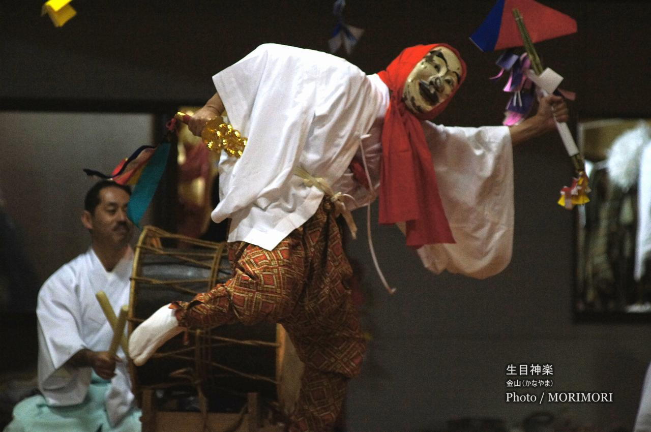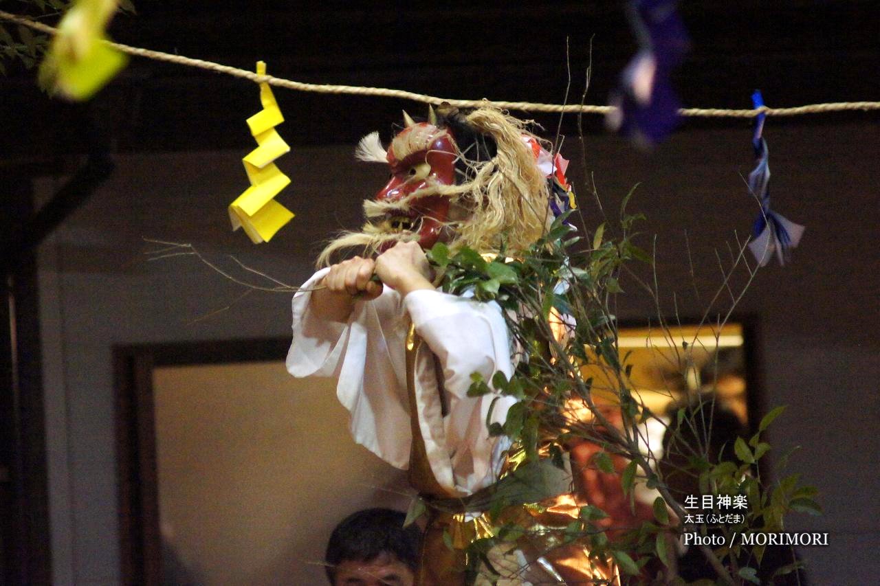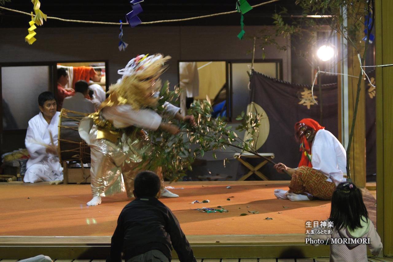 生目神楽は、テンポの速いダイナミックな舞いが特徴。上写真の 番付「太玉(ふとだま)」は、タヂカラオノミコトが柴の大木を引き抜く、力の入った舞です。