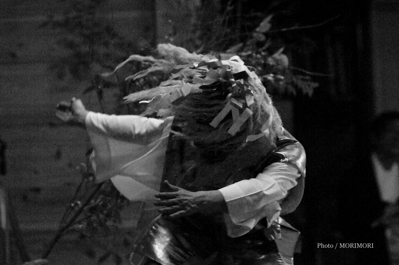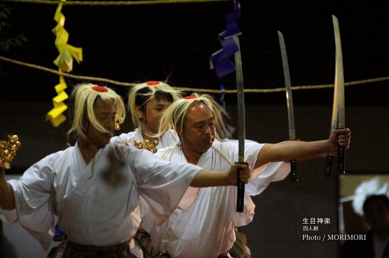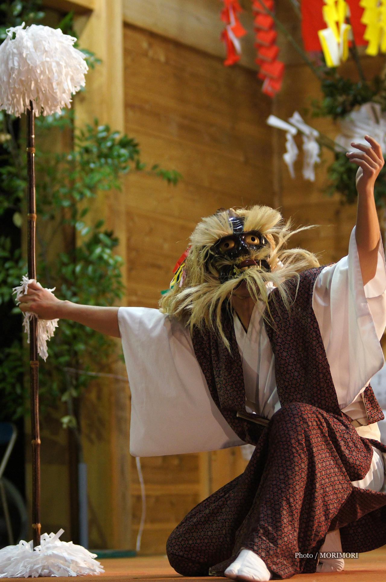 生目神楽は、テンポの速いダイナミックな舞いが特徴。上写真の 番付「太玉(ふとだま)」は、タヂカラオノミコトが柴の大木を引き抜く、力の入った舞です。