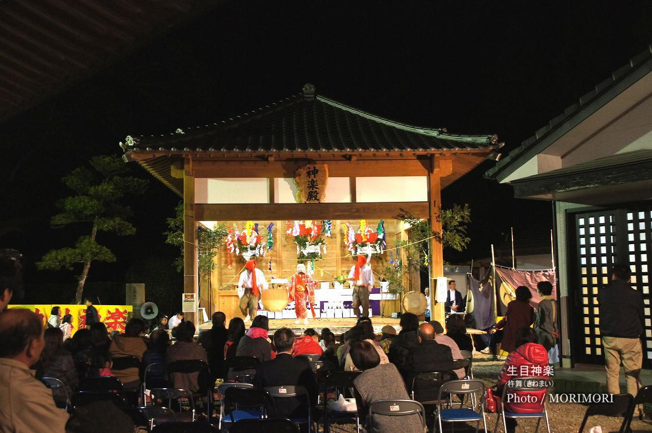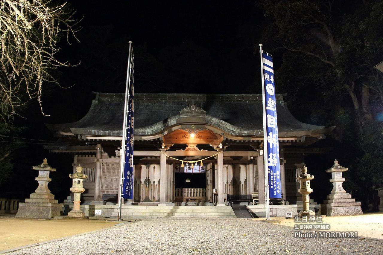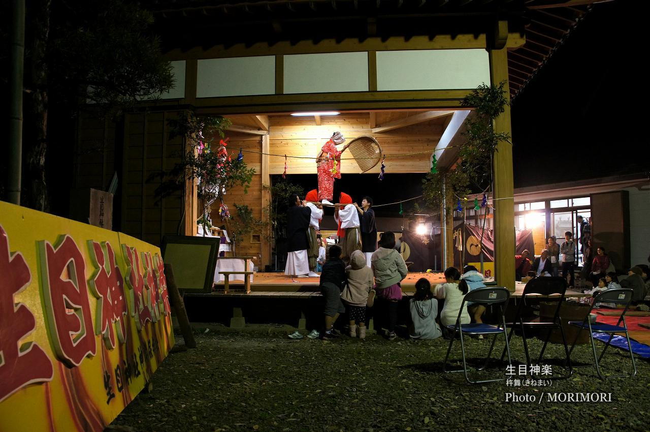 生目神楽は、五穀豊穣(ほうじょう)と無病息災を祈念、3月15日に近い土曜日に、神事の後、午後二時頃より夜半にかけて、生目神社神楽殿で奉納されます。
