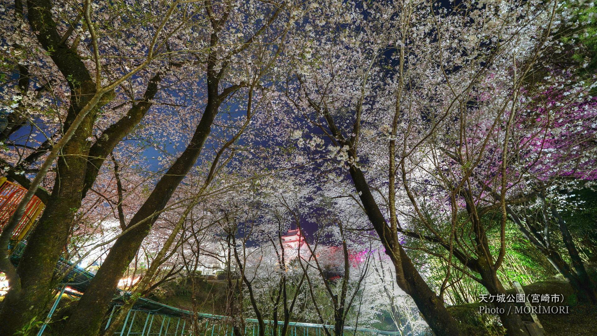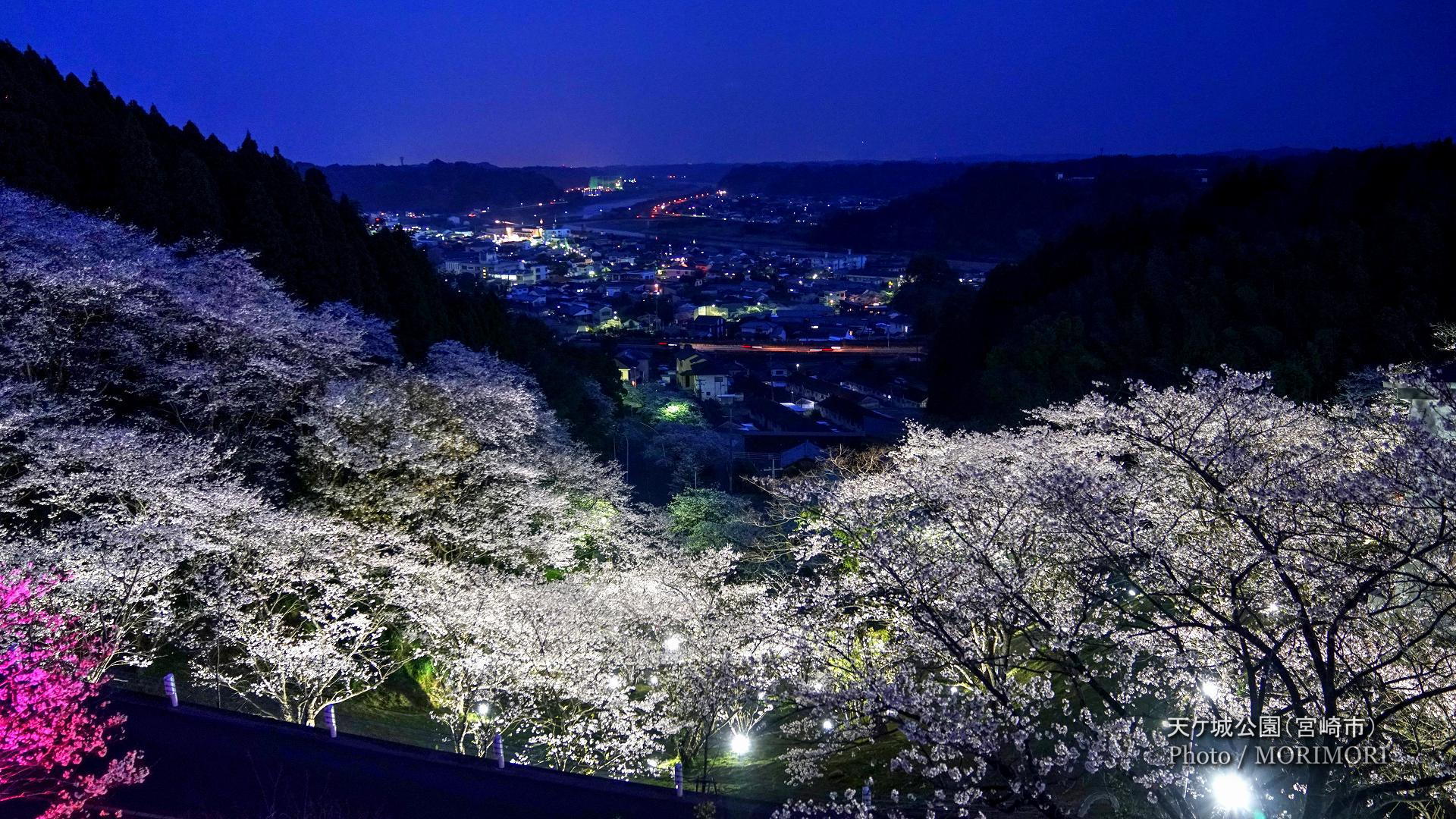 天ケ城公園」は、桜とツツジの名所、標高120メートルの高台にヤマザクラや1,000本のソメイヨシノ、5万本のツツジが咲き誇ります。夜のライトアップされた桜も幻想的。