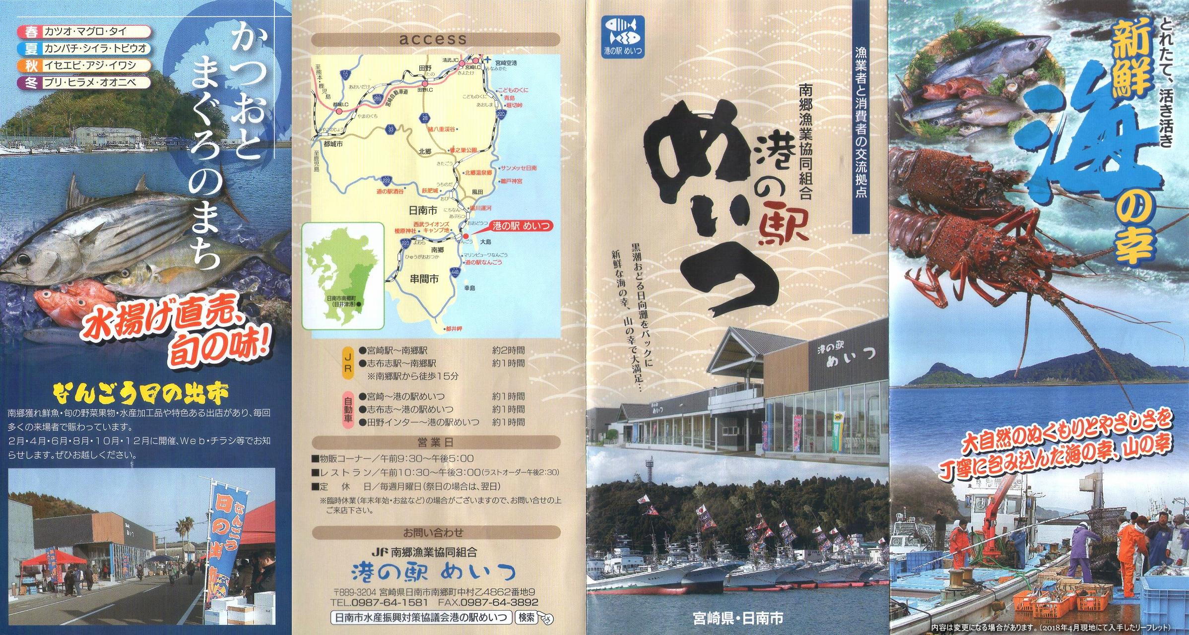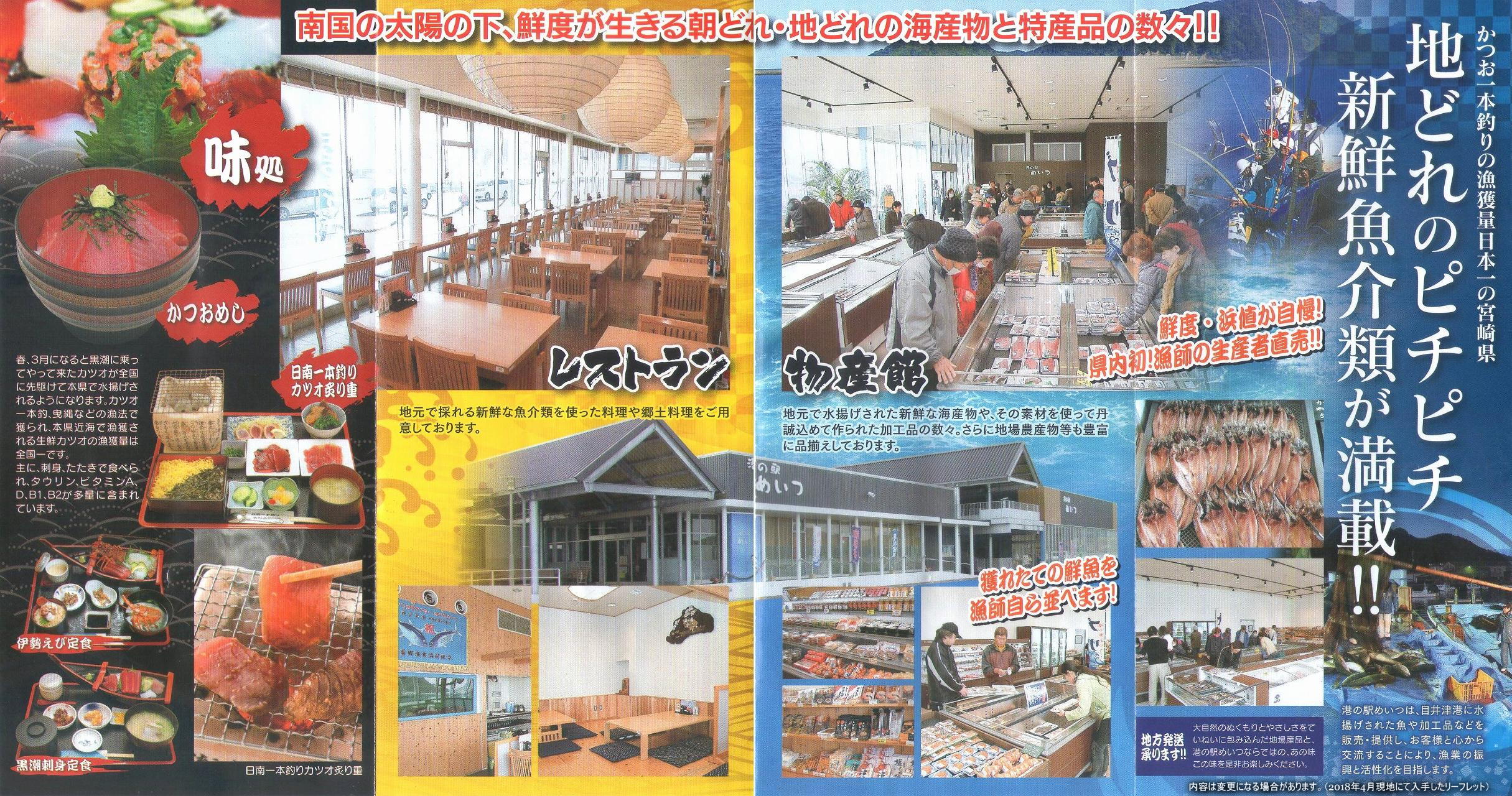 以下の、宮崎県日南市発行の「港の駅めいつ」リーフレットは、2018年4月に現地にて入手したものです。