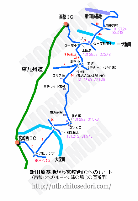 もし、宮崎自動車道方面(鹿児島・熊本方面)へ向かわれるのであれば、私は下記のコースを使い、1本先の宮崎西ICから乗る事をオススメしております。