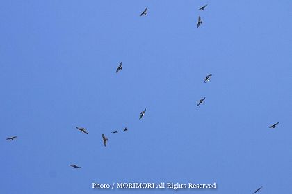 写真は都城盆地より金御岳に沿って駆け上がる上昇気流を受け、数百羽ものサシバの群れが頭上で激しく旋回しながら高く舞い上がっていく「タカ柱」です。(昨年撮影)