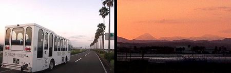 海幸山幸撮影の帰り、220号線南バイパスで偶然「にちなん号」に遭遇、南バイパスから霧島方面を見ると、夕焼けに霧島連山高千穂峰がくっきりと浮かんでいるのが見えました。