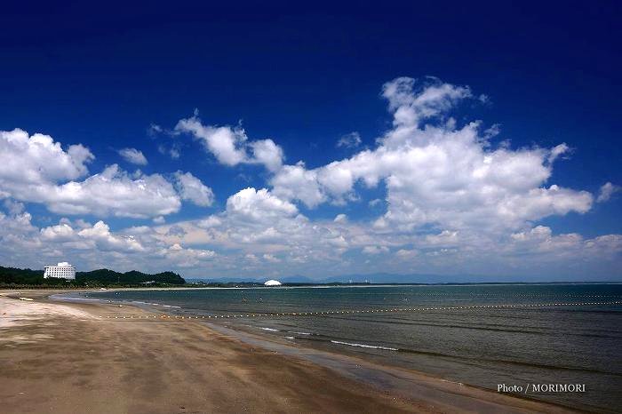 [青島海岸 白い建物がANA ホリデイ・イン リゾート 宮崎 丸い建物は、総合運動公園にある木の花ドーム]