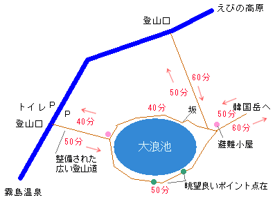 大浪池トレッキング大浪池までは整備されたトレッキングコースという感じで、登り40分下り30分程度のコースです。(もちろん個人差あり)大浪池への一般的な登山口は、えびの高原より霧島温泉へ向かう途中「新床展望台」の少し先にあります。 おそらくこの辺りだったと記憶 鹿児島県霧島町作成の案内図(PDF) 駐車スペースは2〜30台程度。 道路を隔てた所にトイレがありますので済ませた上で登りましょう。 紅葉の名所であり紅葉の時期等ハイシーズンは車が道にあふれるくらいになります。 早めの到着をおすすめします。 大浪池には登山者用の避難所があり、避難所の上から桜島が見えました。 [*以下は一般的な大浪池登山口より登った際の位置関係です。] 大浪池に到着するとそこから分岐して池の西周りコース(右周り)、東周りコース(左周り)のルートがあります。 ルートを進むと韓国岳との鞍部で韓国岳へ(えびの高原側へのルートもある)のルートとなります。このルートを使い大浪池を一周すると約90分(約4km)です。 私は東周りコース(左周り)で大浪池を一周してみましたが眺望は池に向かって右側(東周りコース)が開けたビューポイントの数、日光の具合、背景の韓国岳等含めお奨めです。 韓国岳登山道付近は大浪池鞍部に一度下ってから再度登る感じです。 一周する時間が無ければ適当なところでUターンでも良いかも知れません。 |