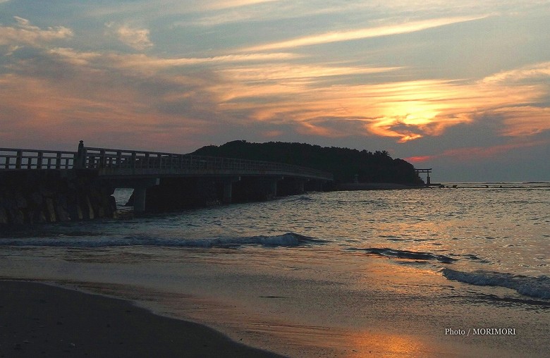 | - 撮影あとがき - 太陽・月の昇る方向は暦により、大きく違います。8月初旬頃は、青島参道、青島へ渡る橋 弥生(やよい)橋延長線上、青島神社鳥居付近に昇りますので、鳥居とあわせて撮るなら、この時期です。 さらに、新月、大潮の日、満潮近くなると、鳥居近くまで海が広がりますので、またとない無い、絶好の撮影日、本日(8月8日)がその日、早起きして東の空を眺めると、天候も良さそうなので、撮影に出かけました。 日の出時間頃には、水平線近くにはうっすらと雲があり、水平線から太陽が昇るところは拝めませんでしたが、水平線から少し昇った太陽は、薄っすらと紅色に・・。 とても幻想的、目的の「神話的写真」には良い感じになりました。 この日(8月8日)の日の出時刻は、午前5:33でした。 参考まで、正月、初日の出の太陽の位置ですが、この位置から見ると、画面上枠外右、青島と白浜の中間あたりです。 → 1月初旬に撮影した日の出はこちらに掲載 当サイト内、関連ページも是非ご覧ください。 → 青島 青島神社(写真入替、当日撮った写真も追加) その後撮影した日の出写真 → 青島のご来光(日の出) |