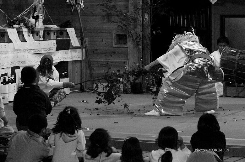 | 宮崎市や日南市など平野部では、夜神楽はなく、日中行われます。生目神楽は昼から夜にかけての半夜神楽です。 個人的に「太玉」は生目神楽の番付中、一番好きな舞です。 「太玉命」が天の香具山の榊を根っこから抜く場面等を交えた動きの激しい勇壮な舞で「柴引き」に通じるものがあります。 (追記)「太玉」ですが、名称、舞いより、この場面に間違いと連想、上の説明を書きましたが、神楽保存会の説明では、太玉は「手力男命(タジカラノオミコト)が樹を根こそぎ起こす舞」との事でした。 宮崎の里神楽 子供たちにとっても、神楽のハレの日は公認で夜も遊べる楽しみな一日だったりします。 この宮崎に伝わる、貴重な伝統文化は、なんとしても後世に伝えてゆかなければならないと思います。 |