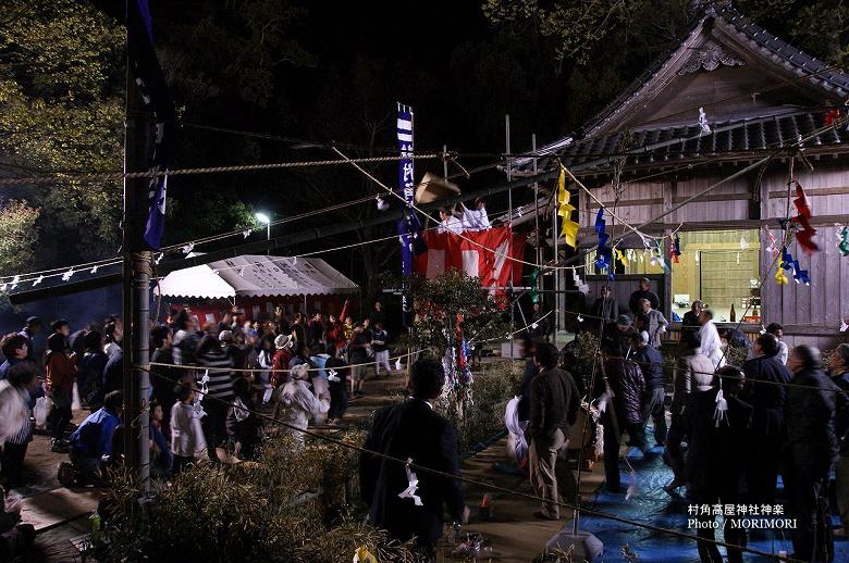 ![]() 村角高屋神社 : 御祭神は、彦火々出見命、豊玉姫命、景行天皇 創建は・・高屋神社参照願います。 村角高屋神社神楽の起源は不詳、戦前まではかなり大規模な奉納で一日がかりだったとの事。 現在は、村角高屋神社の春の社日祭に境内に舞庭が作られ、午後〜夜まで15番程が舞われます。 周囲を竹の柵に囲まれた「張り屋」の中に、神庭周囲を取り囲むように厄入りの方たちが座る場所がある、独特な造りが特徴です。 |