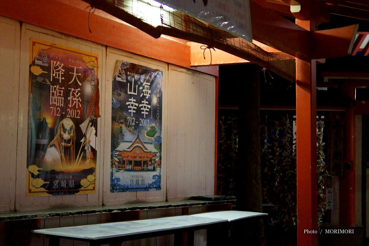 【追記】 今年、平成26年、宮崎市青島鎮座、青島神社の特別神事「裸まいり」の前夜に 夜神楽奉納祭が行われました。 写真を撮りましたので、ここ「記紀編纂1300年記念ページ」で一部の写真を紹介します。 青島神社に祀られる山幸彦(ヒコホホデミノミコト)は、無くした兄(海幸彦)の釣り針を探しに海神の宮へ行きます。 ※ この神話をご存知ない方は、当サイト内、青島神社のページをご覧ください。 釣針を見つけ、海神の宮でお暮らしになった後、青島におあがりになった日が、旧暦の12月17日と記されているそうです。 古くは、その前夜にお祭りを行い、一晩、夜を徹しながら神楽を御奉納、さらに地元青島の民たちが着るものを着ずに朝まで参詣をしたという特殊な神事だったようです。 このように、青島神楽は古くから舞われていたようですが、演舞者の衰退、人が減ってしまい、現在、青島神楽を継承している方は、今回、「鵜戸舞」の際、太鼓をたたいてらした、長友先生お一人となってしまったとの事です。 なんとか、その、かろうじて繋がった糸を残してゆきたいという思いから、この日、特別に青島神楽が一番、披露されました。 今回、舞ったのは、青島神社宮司のご子息(小3)とのことでした。 以上は青島神社 第20代宮司 長友安隆宮司のお話を参考に記載したものです。 (備忘メモ) 主催 青島裸まいり実行委員会 日時 平成26年1月12日(日) 時間 19:00〜20:30 場所 青島神社 拝殿前境内 内容 お祓い・元宮参拝・雅楽・神前神楽(朝日神楽・巫女神楽浦安の舞)・青島神楽(鵜戸舞) 野島神楽(星舞・いれん鬼舞) 観覧 無料 観覧席 イス100席設置 ほぼ満席 ふるまい 先着100名様へ甘酒(ノンアルコール)・青島てんぷらのふるまい有 (18:00〜ふるまい開始、定数に達し次第終了) 駐車場 有・無料 ※旧タチバナホテル跡地 |