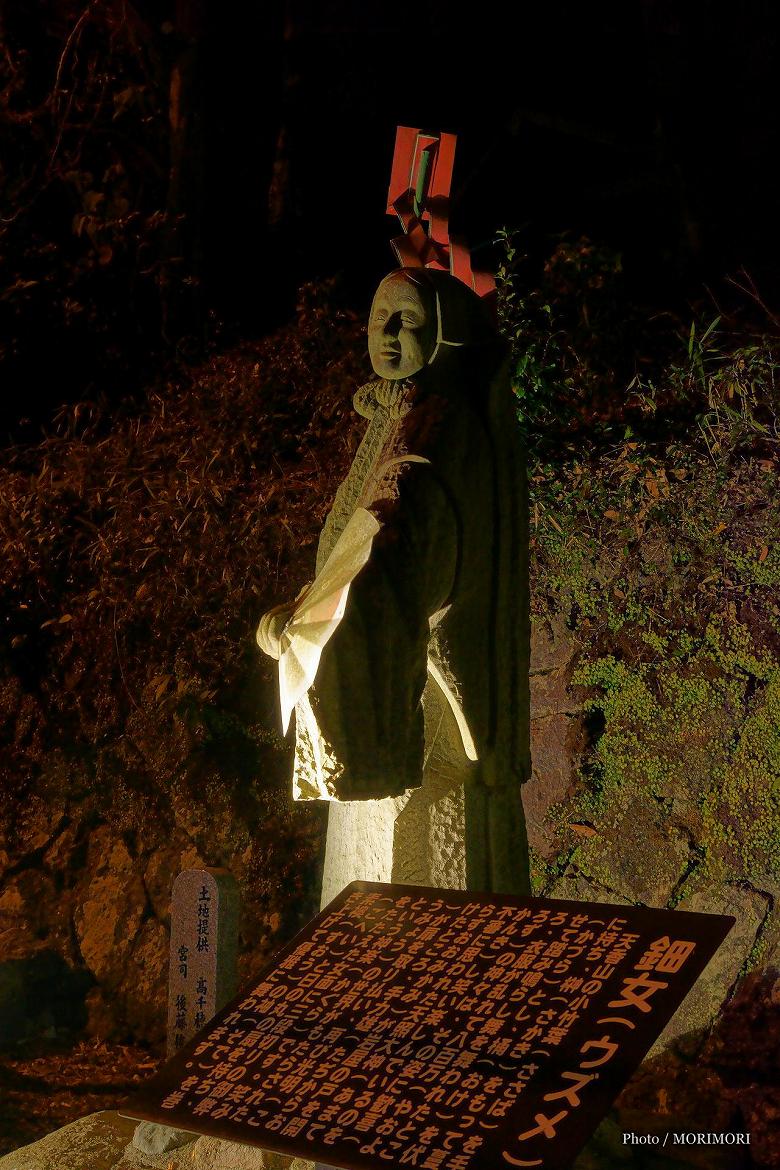 | 昨年11月、毎夜開催されている、高千穂神楽を見に行きましたが、紅葉などの観光シーズンも重なってでしょうか、開演20分前位には立ち見含め溢れるくらいの大盛況でしたので、辞退。 ナイトウォーク 「神話の像」達を見てまわりました。 観光客の方は、神楽へ出かけたからでしょうか、高千穂の夜の街は車も殆ど通らず、ひっそり、いい雰囲気でした。 |