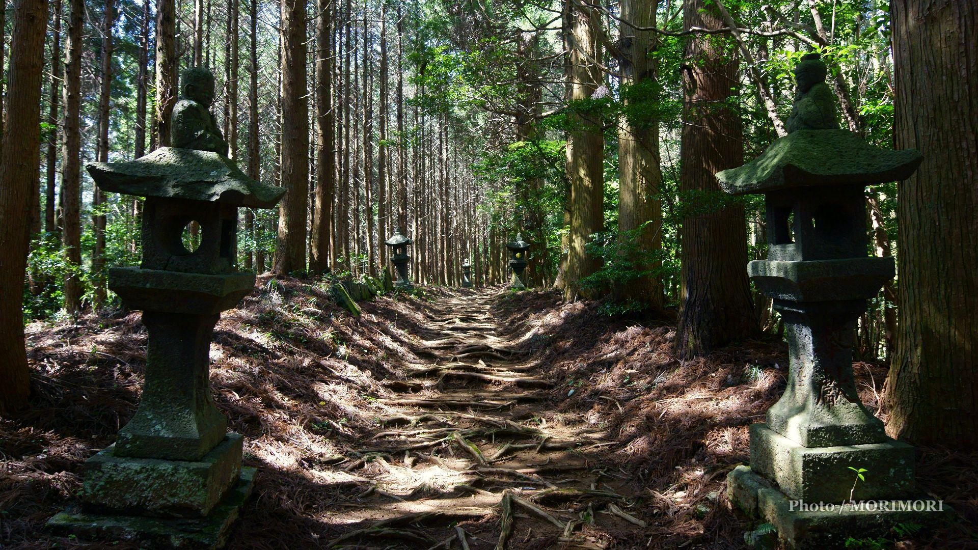 向山神社は鳥居から本殿まで続く、約500mの参道が「熊野古道」を彷彿させる雰囲気で、参道沿いにある仁王像や20基の特徴的な石灯籠も見所です。