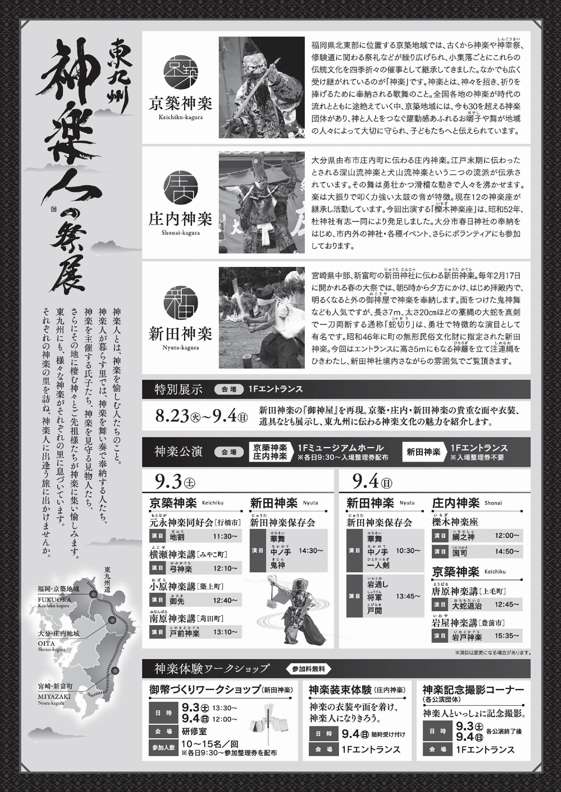 8/23〜9/4までの期間中、御神屋(みこうや=神楽を舞う場所)を再現し、貴重な面などを展示するほか、宮崎県から新富町の新田神楽、福岡県から京築神楽、大分県から庄内神楽の「神楽人」たちが集合、展示や公演を行います。