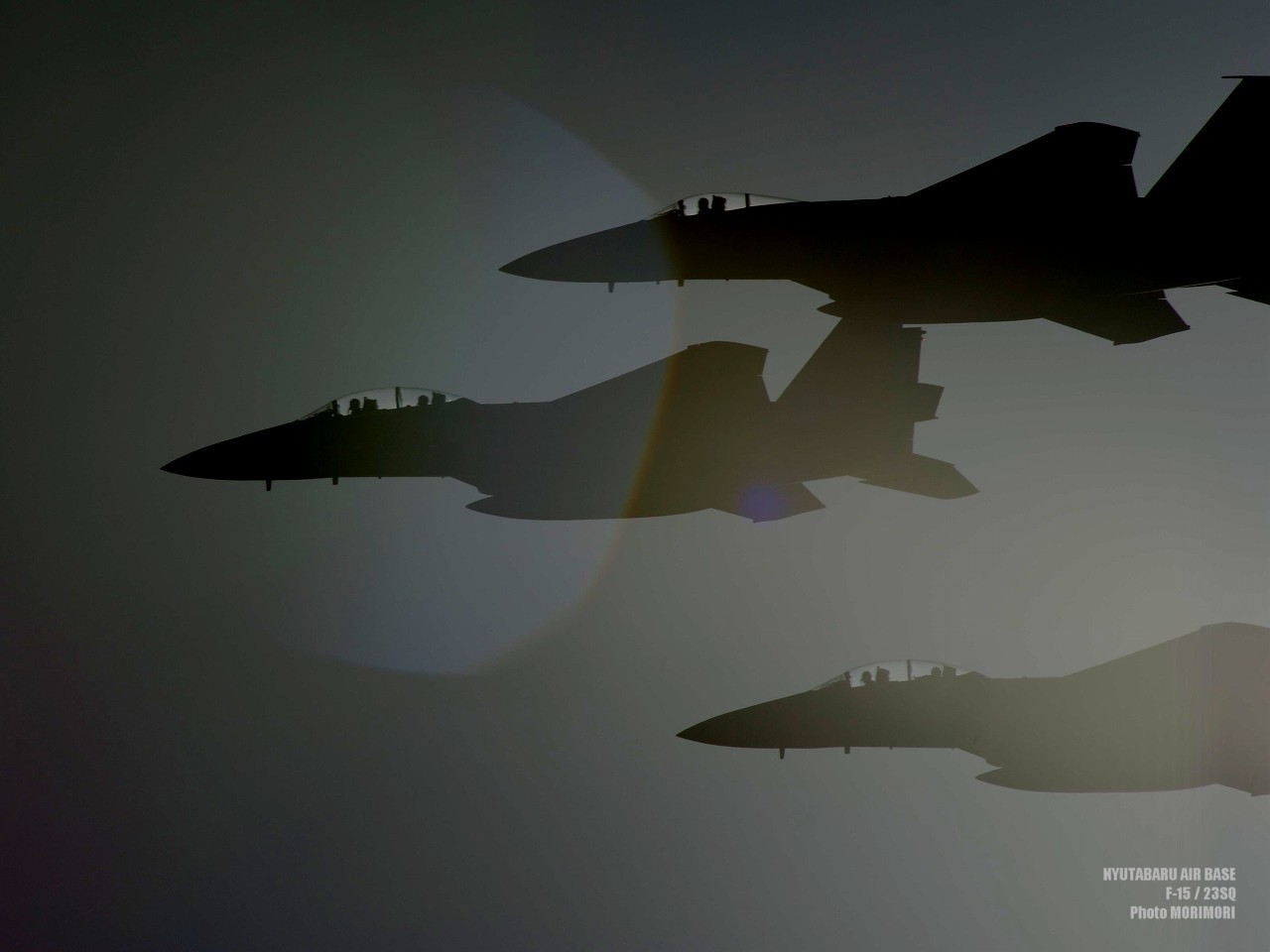 F-15 23SQ 太陽を背景に完全逆光で撮った結果、白黒写真風になりました。フレアの形状がみっともないですが・・・。