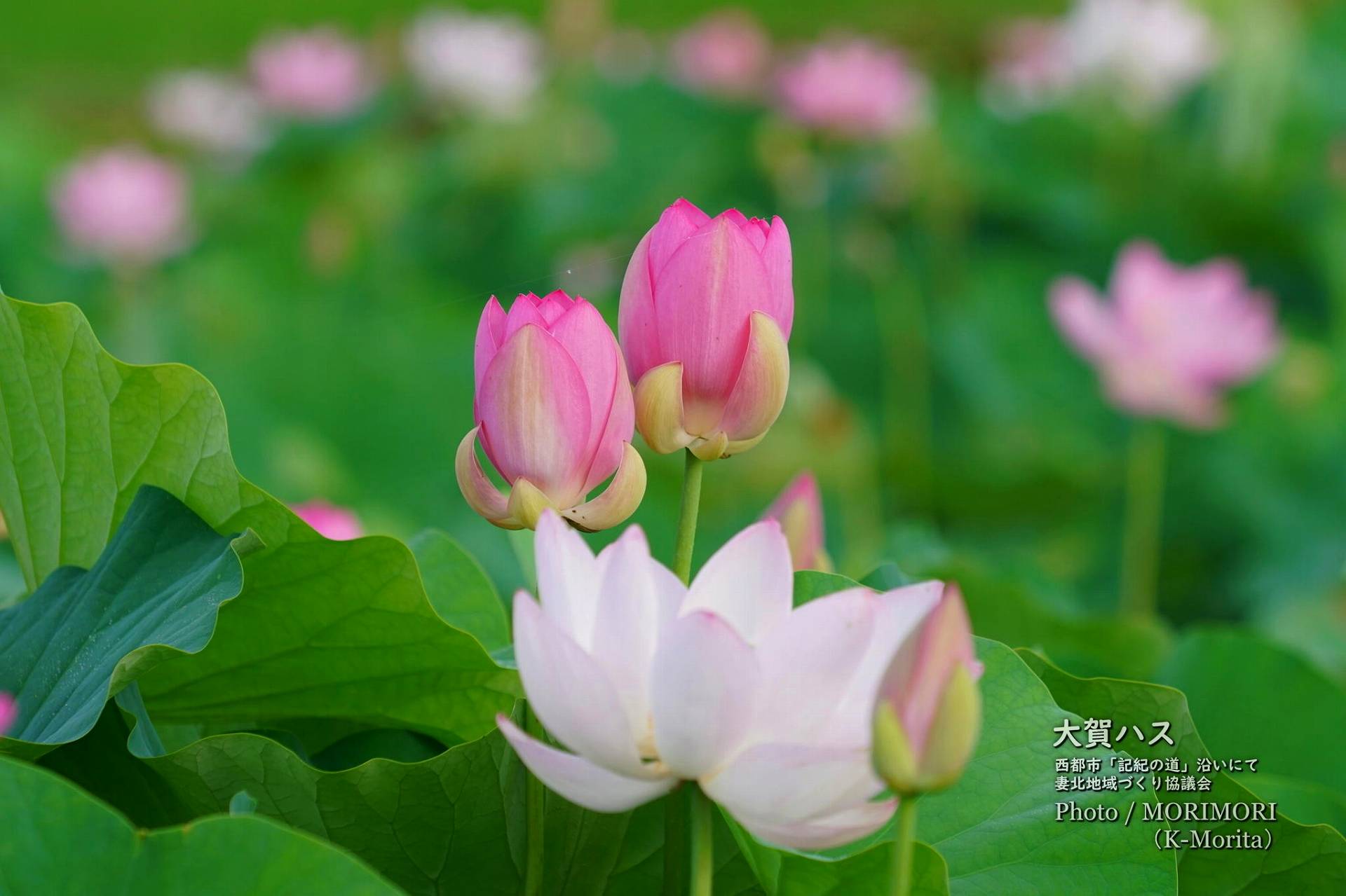 昨年、「妻北地域づくり協議会」の方々によって記紀の道沿いにハス田が作られ、「稚児ヶ池」から大賀ハスを移植したようで、この記紀の道沿いにあるハス田は、条件(土と水温?)が良かったのか、移植して多くの花が見られるようになったようです。