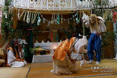 出雲神話の主神・大国主神が、御子七神を招きだす舞、教示鍛える舞といわれる。親神が大杖を持って舞い、子神を順次招き出す。子神は若い舞人が割り当てられるが、近年は子神を観客の神楽体験とする集落が増えている。(高千穂の夜神楽33番ミニ解説より)