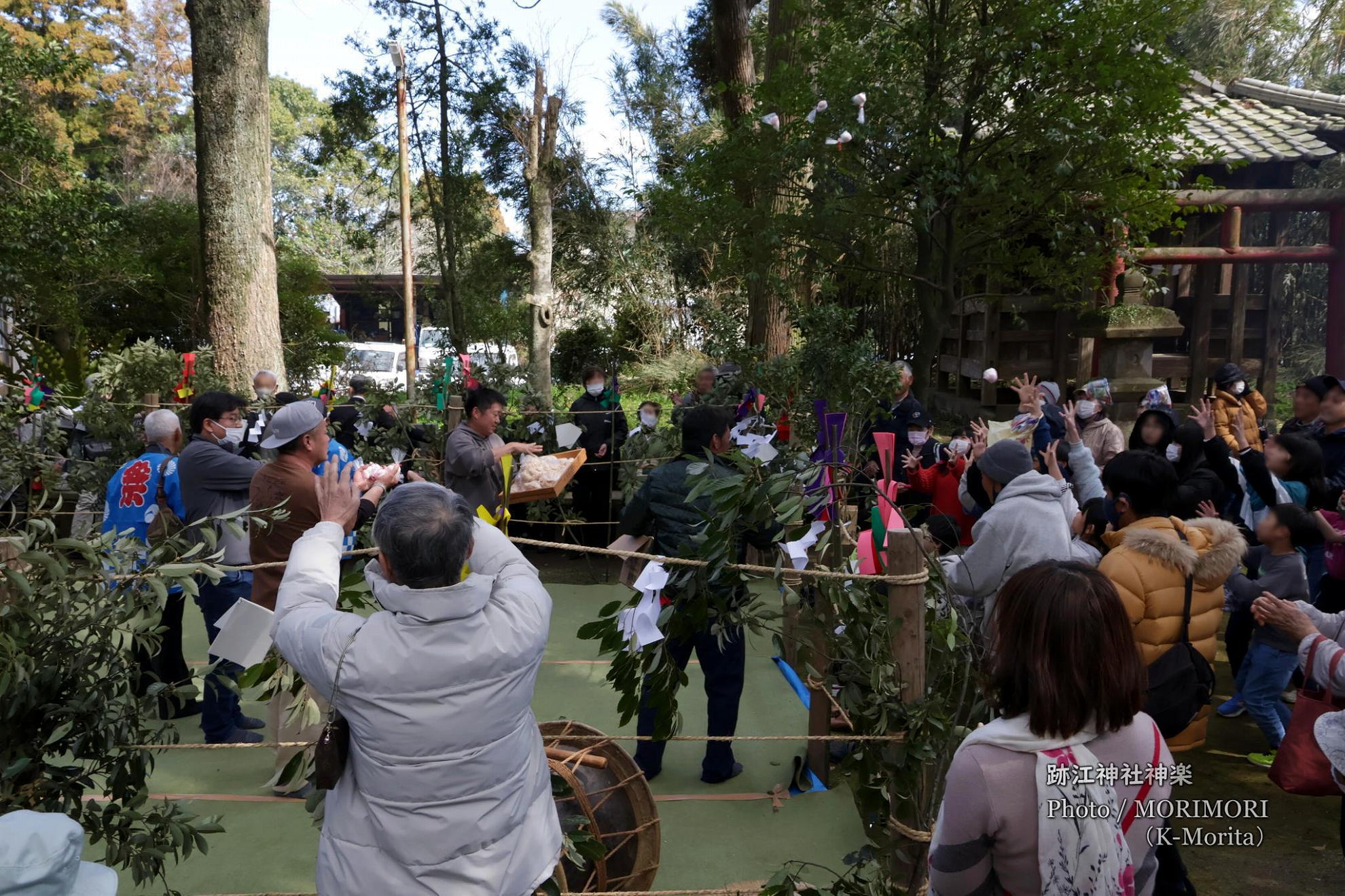 跡江神社は、寛元四年(1246)の創建といわれ、伊勢の豊受皇大神を祀ることから、この地は「伊勢」ともいわれます。また、跡江神楽は湯立神楽を中心とする「伊勢流神楽」であったともいわれます。家内安全、無病息災、五穀豊穣を祈り、午後から夜にかけて舞われる半夜神楽で、勇壮で力強い舞が特徴です。