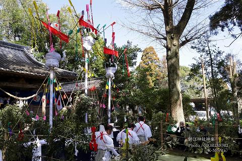 白布で巻かれた3本の注連柱(しめばしら)が立ち、上部には柴束をつけ御幣などが挿され、開扇と赤色布(朝日に映えた雲を表す)が張られている。