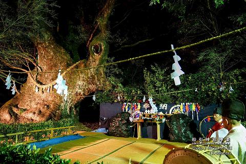 神楽を舞う「神庭」は、大クスの横に設えられ、普段見る事の出来ないライトアップされたこの大クスも見どころの一つです。