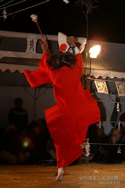 このページでは、祓川神楽の「金山(かなやま)」の写真を掲載しております。 金山(かなやま)鬼神の1人舞。緋狩衣・白足袋を着用し、扇子・藤の鞭を持つ。最後に、地割舞で四方に配った矢を回収する「矢取り」を行う。終了後、地割のセキが御幣を四方に配置する。 (説明は高原町Webサイトより一部引用) 写真はクリックすると別ウインドウで1280pixに拡大します。 |