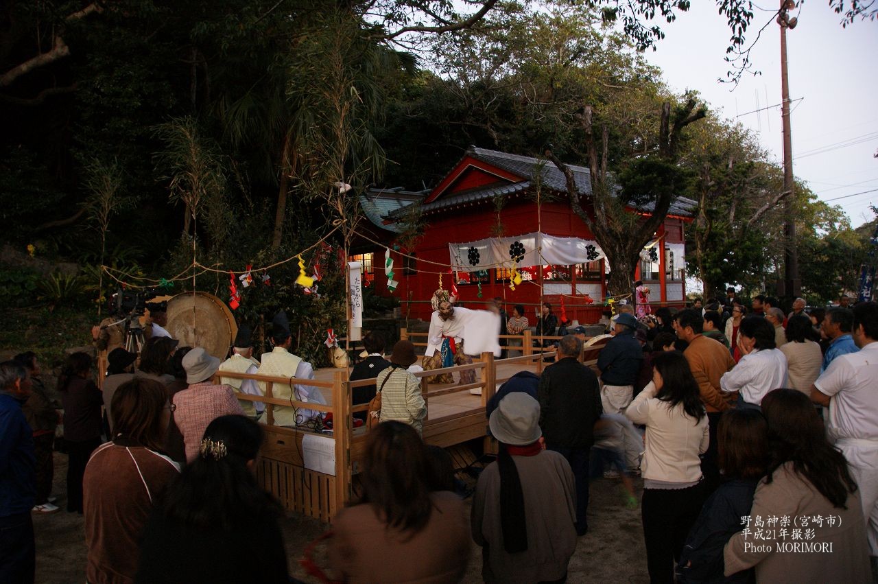 野島神楽(のしまかぐら)平成21年度野島神楽は、浦島太郎の伝説が残る、宮崎市内海鎮座「野島神社」に伝わる神楽で、500年の伝統を誇ります。古くより加江田神社と共演していましたが、寛文2年(1662)の外所(どんどころ)地震以降、野島に残り舞い継がれ、現在、33番のうち22番程伝承されています。 作神楽で以前は、3月20日の春の例祭に奉納されていたそうですが、戦後、早期水稲栽培の普及に伴い、11月23日の秋の例祭に行われるようになったとの事です。 野島神楽は日南海岸沿い、堀切峠、道の駅フェニックスから数キロ南下したところ、内海地区に鎮座する「野島神社」のo秋の例祭(11月23(祝))に昼神楽として奉納されております。 野島神社境内の周りには鮮やかな色の大漁旗が飾られ、独特の雰囲気、境内には立派な神楽舞台、平成21年度は好天に恵まれ青空の下、夕刻遅くまで舞われました。 いくつか写真で紹介します。 以下は、平成21年度の番付です。 この年は「素襖抜き」が復活しました。