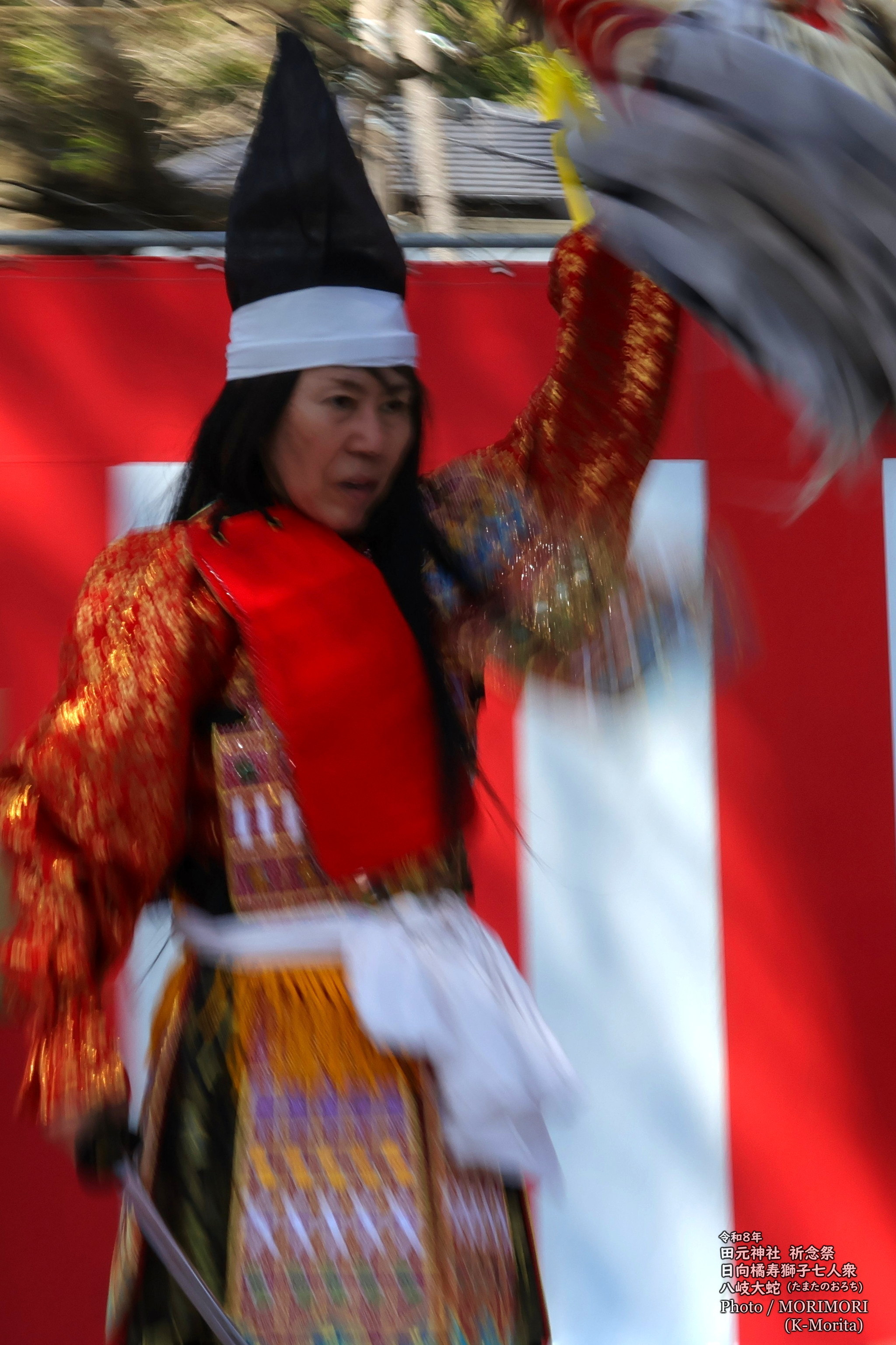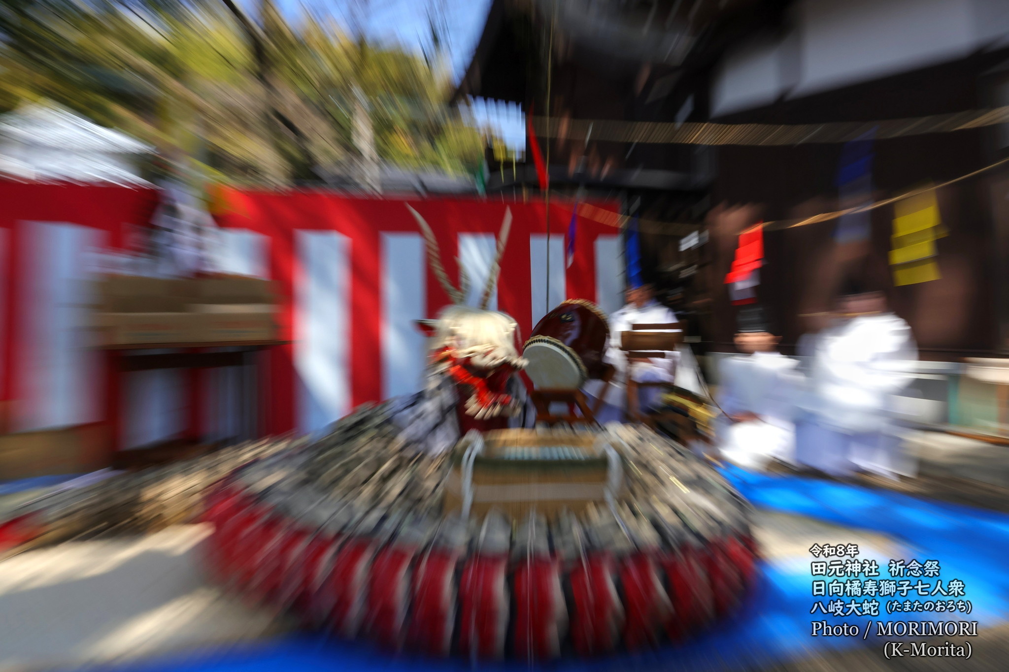 大蛇の躍動感表現の為、あえて、スローシャッター(1/15秒程)で撮っている関係で、ブレが目立つのはご理解を。