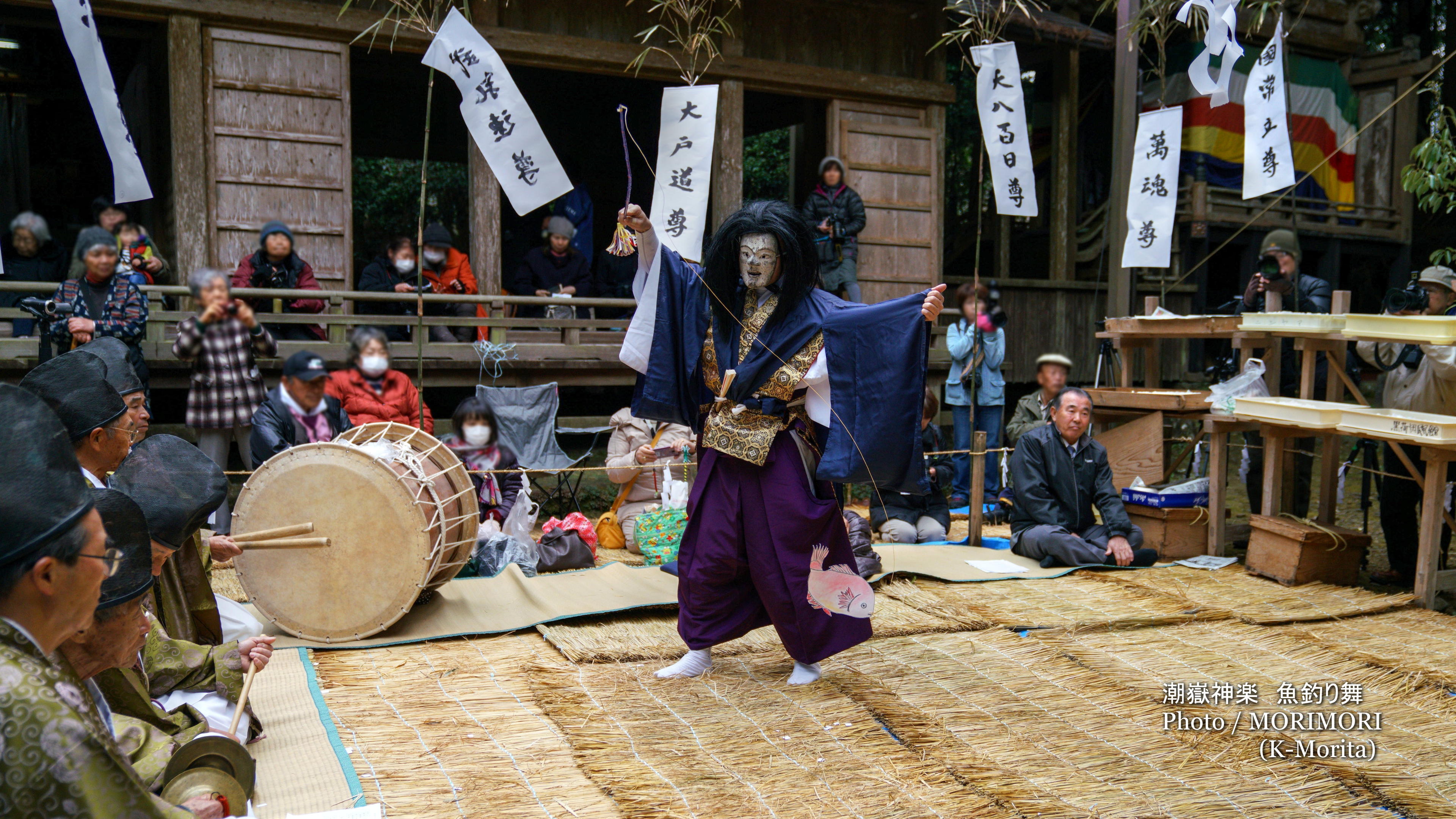 黒毛頭白色の面を着け、採り物は釣り糸を垂らした釣り竿。唱儀に於いて天地開闢より海幸山幸の来歴を物語る、潮嶽神楽ならではの舞。