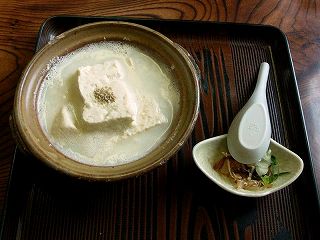 元祖、嬉野温泉湯豆腐 よこ長(ちょう)の湯どうふ名物 嬉野温泉の温泉湯豆腐 嬉野温泉ではあこちで温泉豆腐の看板を目にする、その温泉豆腐の元祖と言えるのが、ここ「宗庵よこ長」です。古来、嬉野温泉のお湯(弱アルカリ泉)は胃腸に良いとされており、名物湯豆腐はこのお湯を使った料理。 宗庵よこ長の初代が、実家の豆腐屋でこの嬉野温泉のお湯と木綿豆腐の不思議な関係(温泉のお湯で炊くと柔らかくなり、とろける)に着目、それを料理にした事から始まるそうで、時、昭和32年の事とか。 豆腐の凝固剤として使われる天然の「ニガリ」の成分である塩化マグネシウムと、嬉野の温泉水に含まれるナトリウムが化学反応を起こし豆腐の旨味を引き出すと共にとろけるように柔らかくなるので口当たりが一層滑らかな湯豆腐になるようです。 とろけて白濁した湯汁と味付け(出汁)が絶妙で、湯豆腐の概念を打ち破るほどこれは美味しいです。 なお、「美味しんぼ」の第32巻で掲載されたとか・・。 「宗庵よこ長」のメニュー 「宗庵よこ長」のメニューはいろいろありますが、価格等は湯豆腐を例にとると。湯どうふ 420円 寄せ湯どうふ 580円 湯どうふ定食 790円 などです。 嬉野温泉、湯どうふ よこ長の住所地図等〒843-0301 佐賀県嬉野市嬉野町下宿2190 地図 アクセス JR佐世保線武雄温泉駅 バス30分 JRバス嬉野温泉バスセンター 徒歩5分 営業時間 10時〜21時、水曜定休、水曜が祝日の場合は翌日が休み。(2007年3月現在) お昼時は混みますので少し時間をずらして行った方が落ち着いて食べる事が出来ますので良いかも知れません。 |