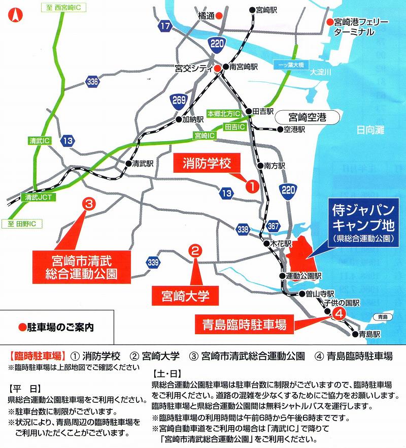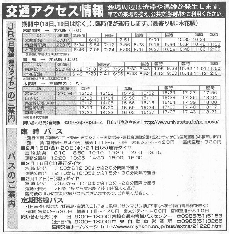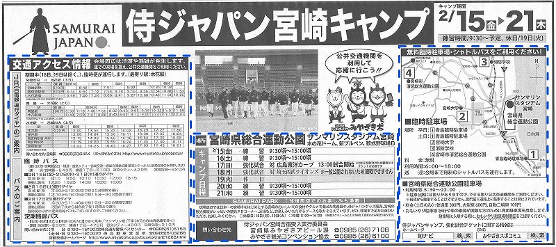 | 2013年WBC日本代表候補合宿 侍ジャパン宮崎キャンプ アクセス新聞に掲載されていた、侍ジャパン宮崎キャンプへの臨時列車・臨時バス・臨時駐車場等、アクセス案内等 |