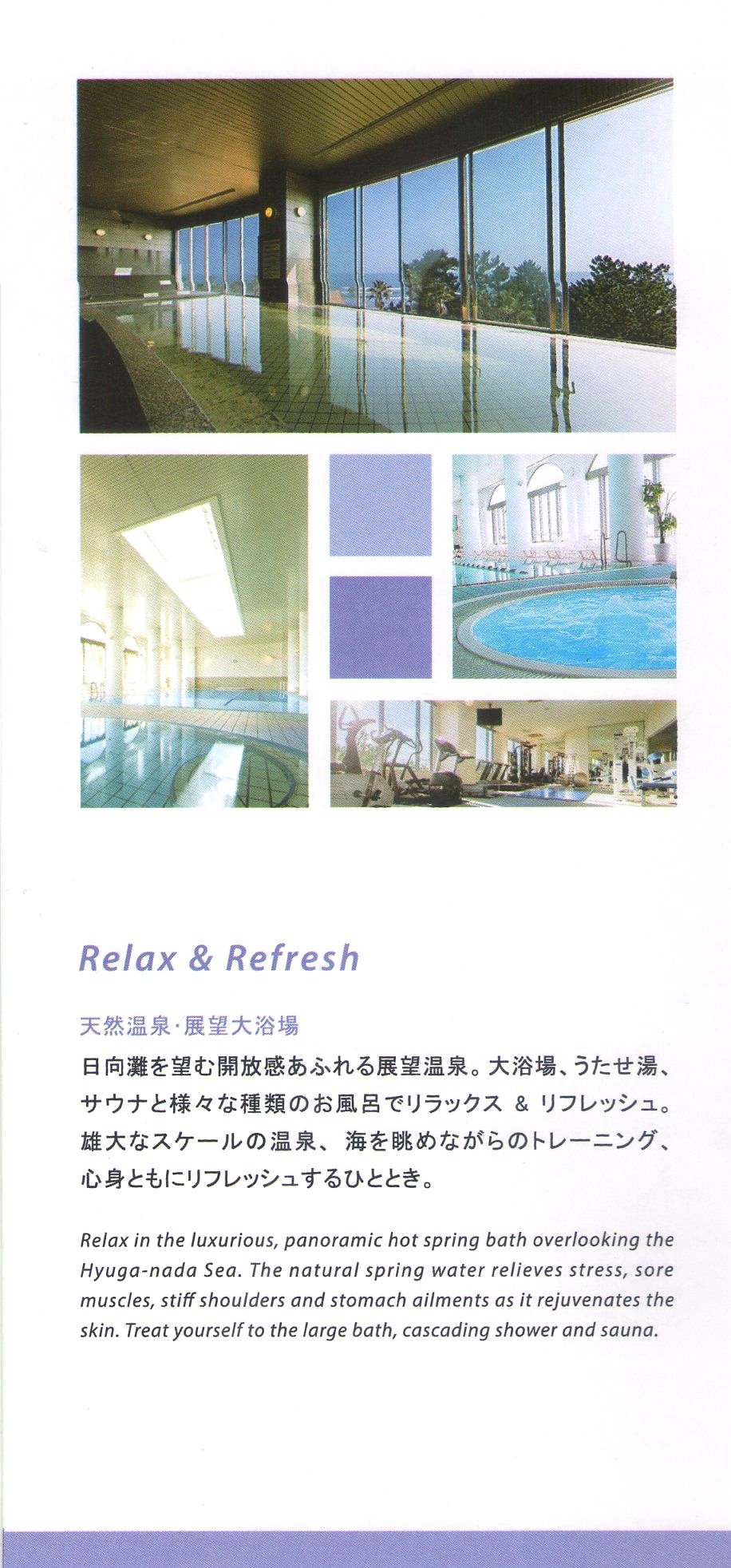 「ANAホリデイインリゾート宮崎宿泊実は・・自転車でも行ける距離にあるので・・宿泊したことが無かったのですが・・・、2014年9月に宿泊しました。 〜 とても落ち着く、良いホテルです。今回泊まった部屋は7階のトリプルの洋室、青島海岸、こどものくに、運動公園、シーガイア方面などの眺望も良く、夜は9月末まで行われていた期間限定のLED照明のショー「光の音のファンタジー 青リゾラグーンナイト2014」を眼下に見ることも出来ました。 「ANAホリデイインリゾート宮崎」の館内は吹き抜け空間が印象的、色調も優しい色使いで、リラックス、落ち着きます。 青島温泉もいい!お肌つるつるになる美人の湯。天候が悪く温泉から青島に昇る朝日が見られなかったのは心残り。 バイキング料理もおいしく、おなか一杯頂き、大満足。 とても良い、リラックス出来るホテル、一時のリゾート気分を満喫しました。 「ANAホリデイインリゾート宮崎」は、「青島パームビーチホテル」時代から、長年、読売ジャイアンツ(巨人)のキャンプの際、一軍の宿舎としても使われております。 少しですが写真を撮りましたので、パンフレットと共に紹介します。 |