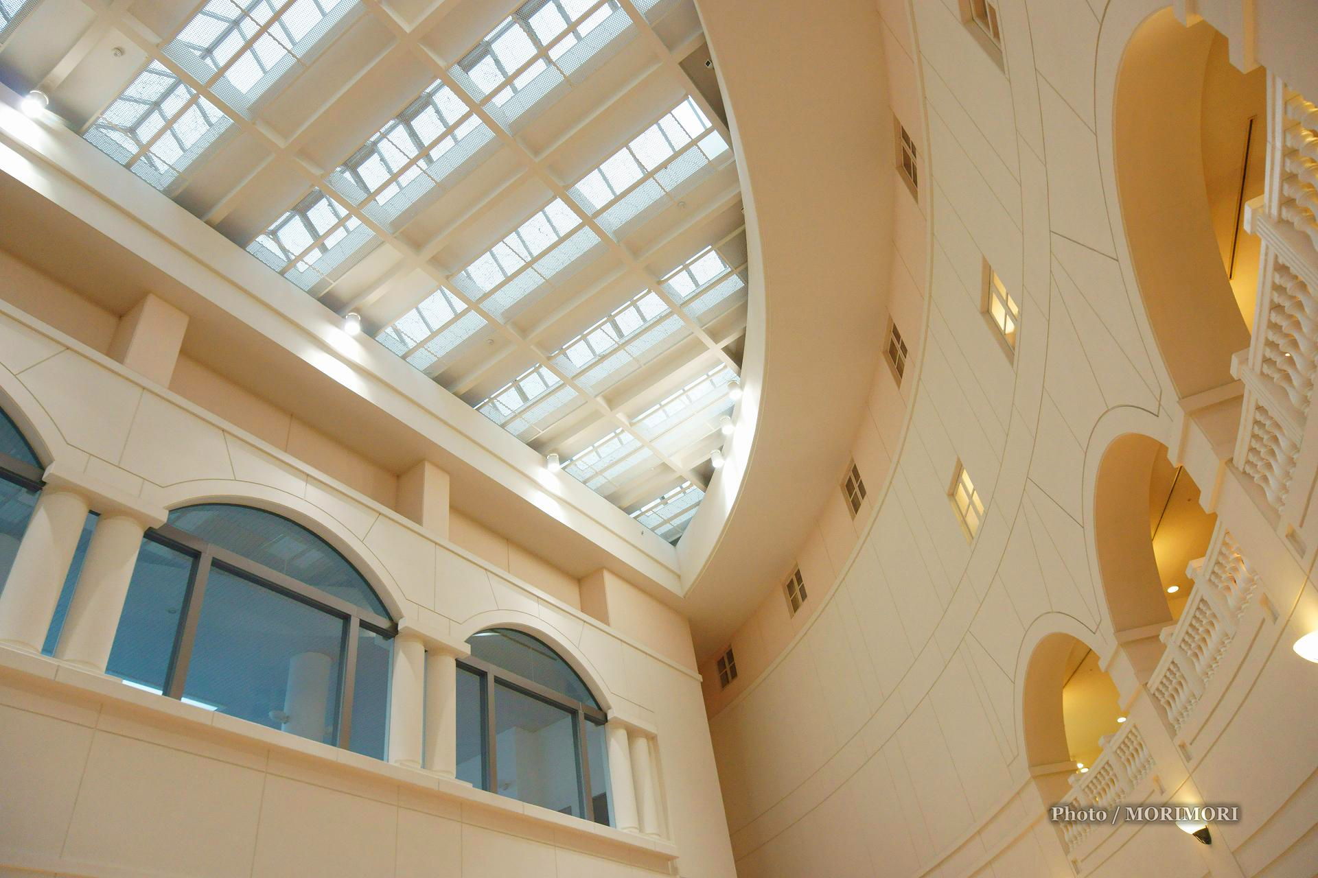 吹き抜けのこの空間とても良いです。 階段の横にはカプセル型のエレベーターが三連。 |