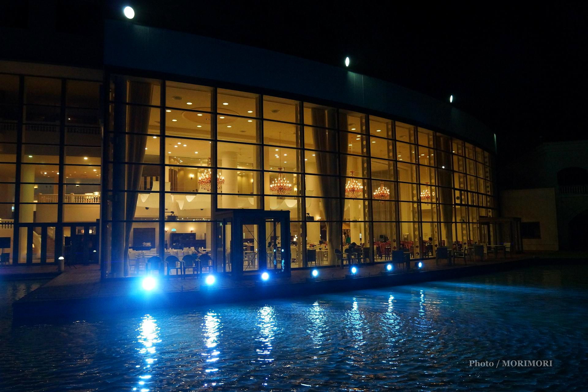 夕食後は外に出て周辺散策、ライティングされた夜の水辺の雰囲気がいいです。 |