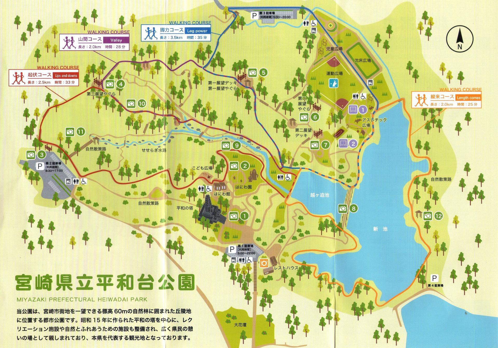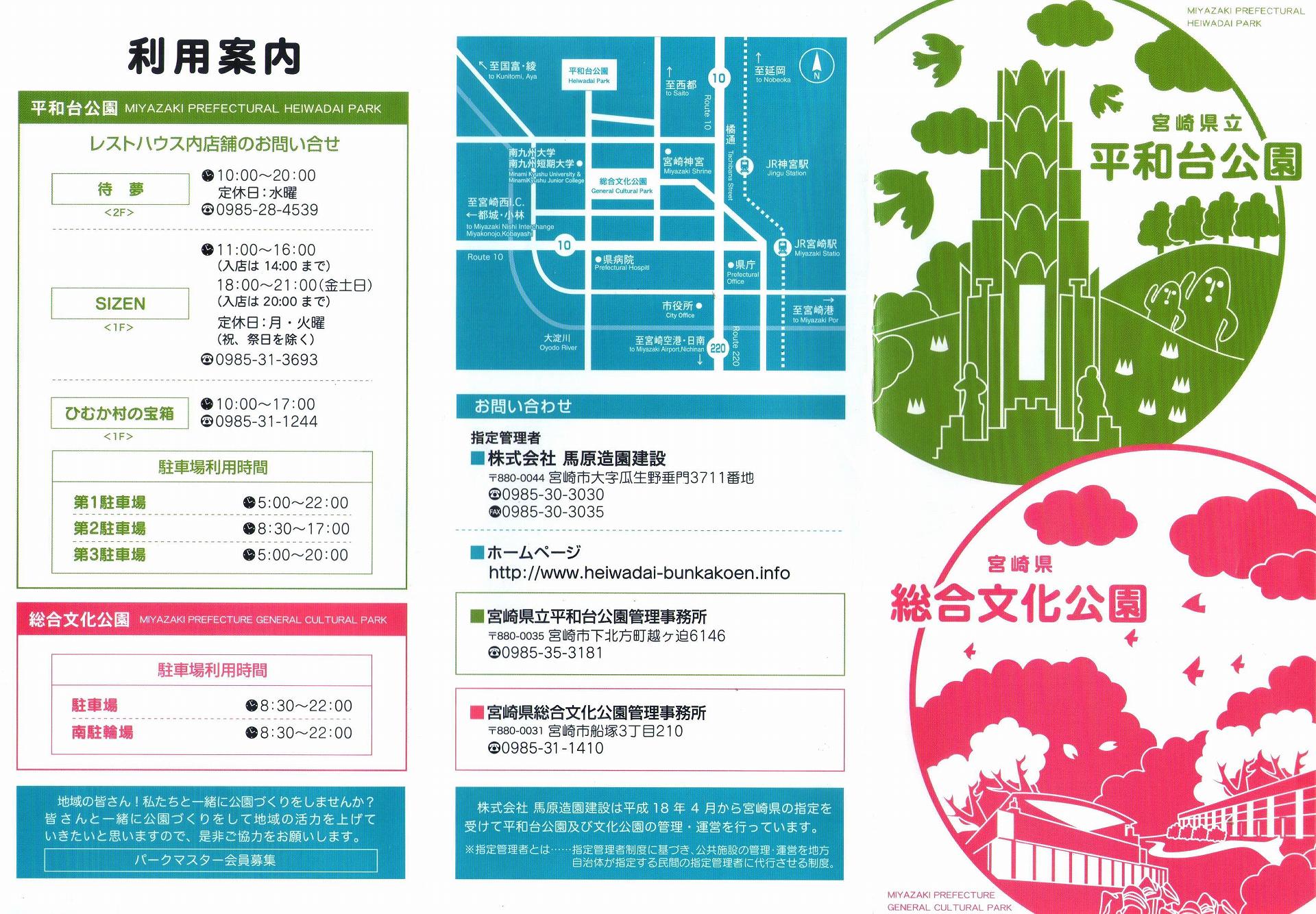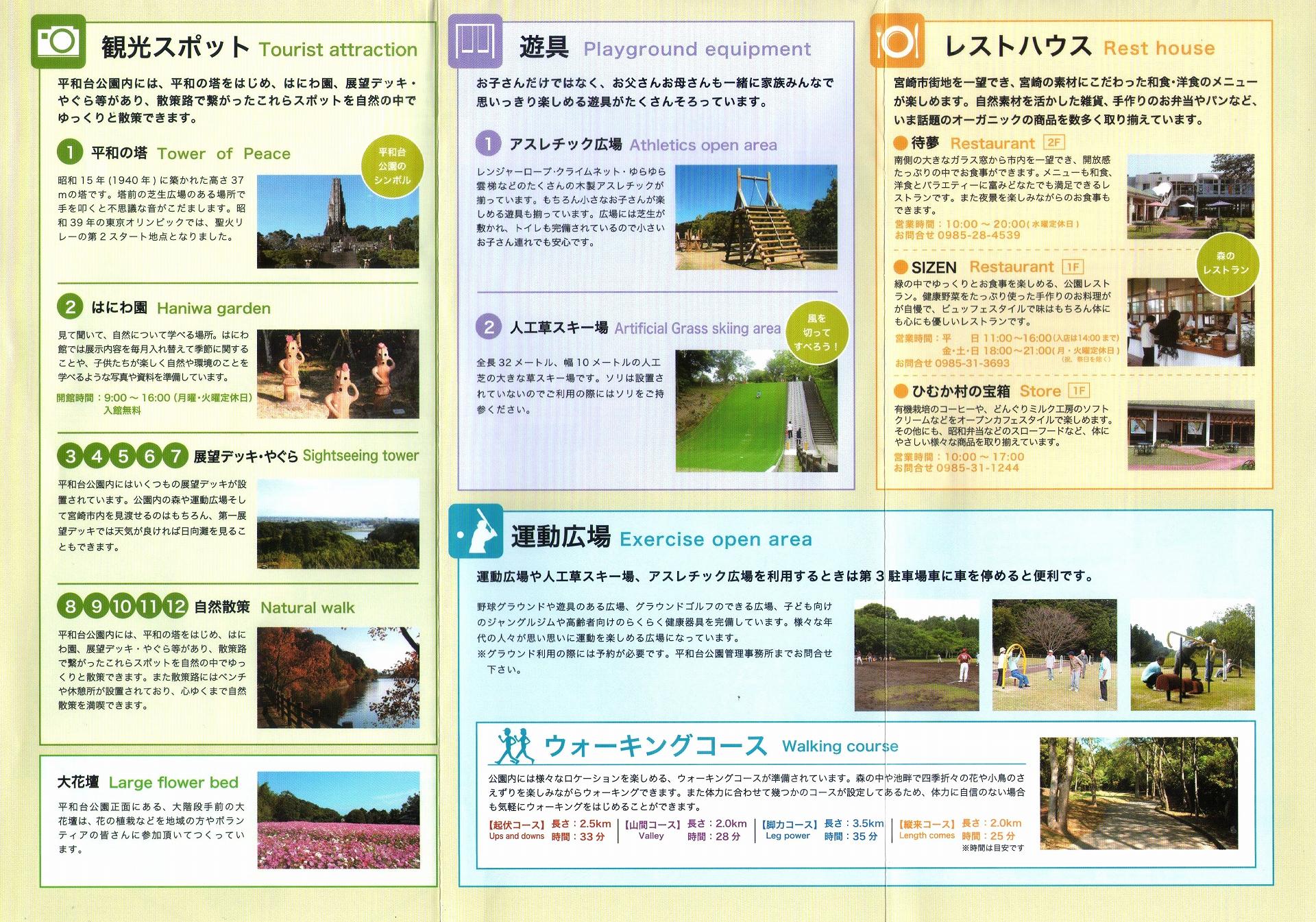宮崎県立平和台公園|宮崎県総合文化公園 リーフレット(パンフレット)宮崎県宮崎市にある「平和台公園」「総合文化公園」のリーフレット(パンフレット)です。 ※ 2014年 7月入手 情報は発行時点のものです、内容は先々変更になる場合もあります。最新情報は、公式サイトを参照願います。下記画像はクリックすると最大1920pix幅に拡大します。 宮崎県立平和台公園・宮崎県総合文化公園 利用案内![]() 宮崎県立平和台公園案内当公園は、宮崎市街地を一望できる標高60mの自然林に固まれた丘陵地に位置する都市公園です。昭和15年に作られた平和の塔を中心に、レクリエーション施設や自然とふれあうための施設も整備され、広く県民の憩いの場として親しまれており、本県を代表する観光地となっております。 ![]() ![]() 宮崎県総合文化公園案内置県100年記念事業として、昭和60年度から平成6年度にかけて宮崎大学農学部跡地に県民文化の拠点づくりを目指して整備された公園です。2つの広場(県民広場、文化広場)と3つの文化施設(県立図書館、県立美術館、県立芸術劇場)とを一体的に整備し、人々がくつろぎ憩う線量かな文化の薫り高い公園となっています。東西450m、南北370mの長方形の敷地を2つに分け、乗側に図書館、美術館、芸術劇場の3つの文化施設と文化広場を、西側に県民広場を配置しています。 文化広場は石畳を中心に構成され、彫刻や噴水を配置し、各施設の建築美が調和した落ち着いた雰囲気となっています。 県民広場は、園路、芝生広場、はなしょうぶ園を設置し、どこからでも人の出入りができる緑の広場となっています。また、災害時の避難地や、降雨時の排水調整などの防災機能も持っています。 ![]() 当サイト内関連ページ 宮崎県立平和台公園 宮崎県総合文化公園の桜 宮崎県立平和台公園|宮崎県総合文化公園 リーフレット(パンフレット)※ こういった一枚を折りたたみ冊子風にしたものは、「リーフレット」と呼ばれますが、しかしながら世間一般的には、「リーフレット」も「パンフレット」と呼んでしまう傾向がありますので、インターネット検索等でお探しの方の事を考え、このページでは(パンフレット)もあえて併記させていただきました。 |