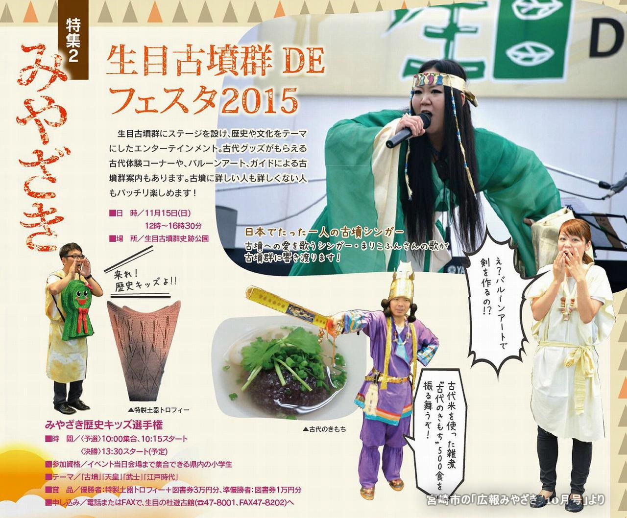 《生目古墳群 DE フェスタ2016 開催のお知らせ》 生目古墳群 DE フェスタ2016 11/23(水・祝)開催 今年も「まりこふん」さんのライブなど・・ まりこふん イタ車が用意されて!?SPが2人!?なんだそりゃーーー!!! ・・・なんかもう半端ないっす!!生目古墳群!!!ww イキイキし過ぎだ!生目古墳!! 以上 こちらより 【追記・情報】生目古墳群 DE フェスタ2015のお知らせ日時:2015年11月15日(日) 12時〜16時30分 開催場所:生目古墳群史跡公園 内容: (1)ステージ 12:30〜12:40和太鼓演奏(和太鼓一家颯) 12:40〜12:50オープニング 12:50〜14:00みやざき歴史キッズ選手権決勝 14:00〜14:15ベリーダンス(Costa.Brava−コスタブラバ−) 14:15〜14:30キッズダンス(スタジオRスマイリー) 14:30〜14:50コーヒーブレイク 14:50〜15:40まりこふんライブ(まりこふん) 15:40〜16:05よさこいソーラン踊り(生目よさこいソーラン会) 16:05〜エンディング (2)会場 ○軽食ブース:焼きそば、ポテト、飲み物等の販売(生目商工会) ○古代食ふるまい:「古代のきもち」(雑煮)ふるまい※限定500食 ○バルーンアート:風船で花や剣などを作る(外部講師) ○古代体験ブース:どんぐりを使った玩具作り(遊古会) ○まりこふんブース:まりこふん氏の活動紹介(古墳にコーフン協会) ○展示ブース:生目古墳群関連のパネル展示 入場無料 ※軽食販売等は一部有料。 雨天決行 ※雨天時は、生目の杜遊古館にて開催。 ※午前10:00からは「みやざき歴史キッズ選手権」の予選を生目の杜遊古館にて実施。 生目古墳群 DE フェスタ 2014告知チラシ+生目DEこふフェスタ 2014年 画像&かんたんレポート |