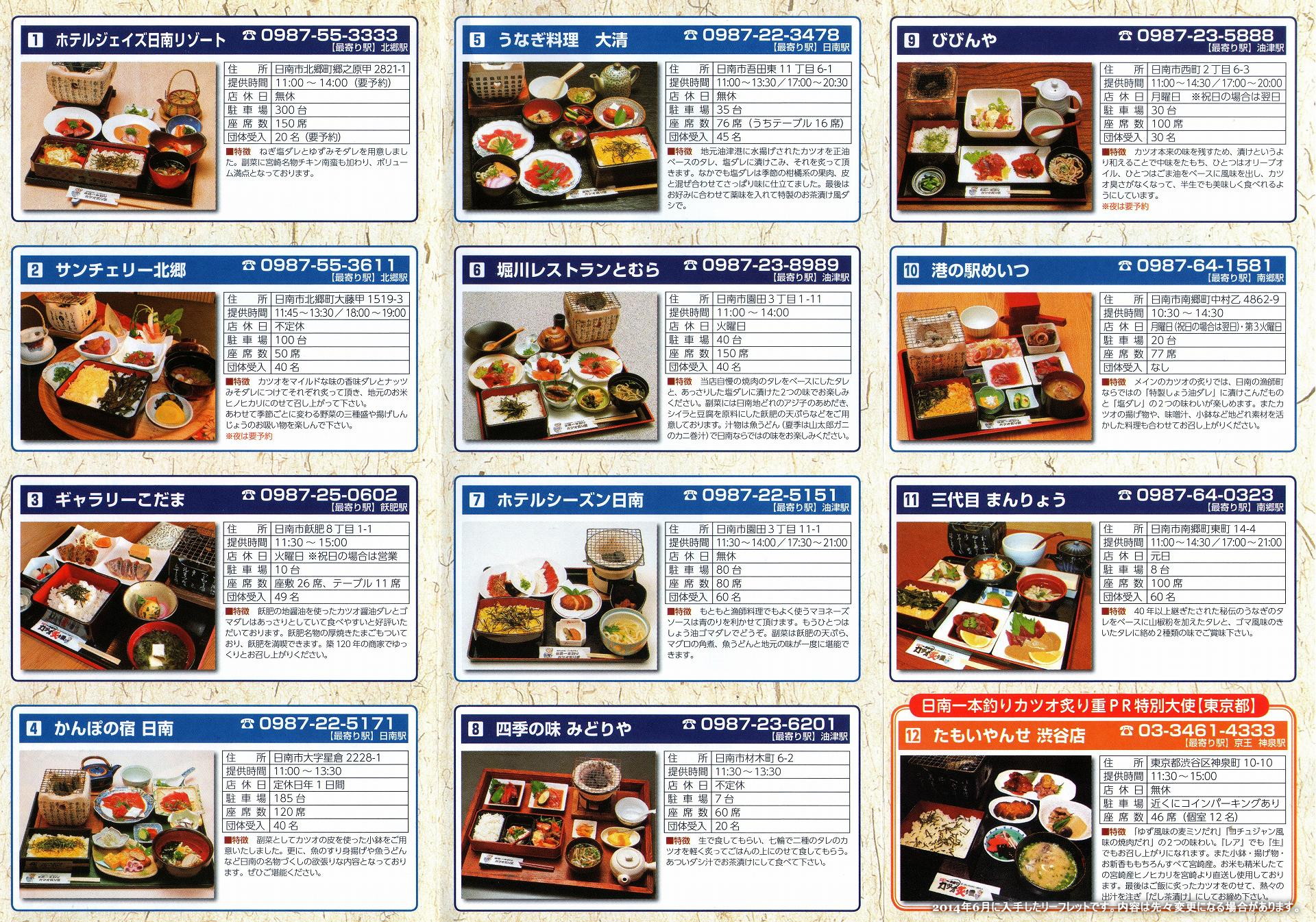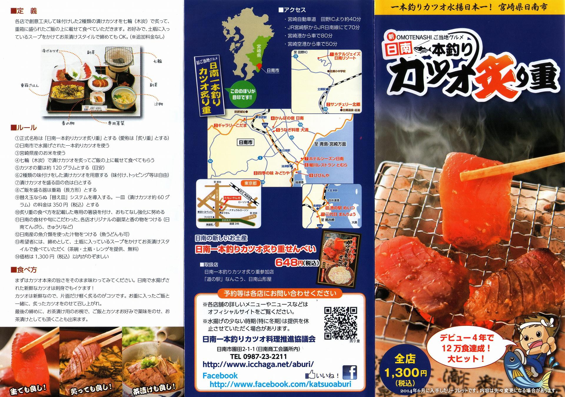 新ご当地グルメ 日南一本釣り カツオ炙り重 パンフレット(リーフレット)などの紹介日本一のカツオ・マグロ基地、宮崎宮崎県は近海カツオ一本釣りで日本一の水揚げを誇っています。 10トンクラスの船が主力の沿岸マグロはえ縄漁でも日本一、カツオ・マグロの王国です。 宮崎県内では、日南市の油津、大堂津、南郷町目井津(めいつ)などが水揚げ基地として有名です。 詳しくは → 宮崎県発行の季刊誌 「Jaja」Vol.16号 日南にいらしたら是非、新鮮なカツオの「刺身」、「かつおめし」、大人気のご当地グルメ「日南一本釣りカツオ炙り重」1,300円(税込)などを是非お召し上がりください! 今回は、「日南一本釣りカツオ炙り重」の紹介です。 ![]() 上記写真は、「ホテルシーズン日南」にて、撮影 マヨネーズ味も美味しかったです!! 具材だけを考えれば、価格的には、少々高めかな・・と思いますが、プチ七輪で新鮮なカツオを炙って食べるというのがなんともイイです。刺身など、生ものが苦手な人も、焼き加減はお好み次第、とれたて新鮮なカツオを美味しくいただけます。但し・・ 煙もなどをあびると、ニオイなどが髪の毛とかに付いてしまう場合もありますので、ご留意を。 「日南一本釣り カツオ炙り重」提供店舗の地図 GoogleMap 10店舗 + GoogleMap 三代目まんりょう 以下は、日南一本釣りカツオ料理推進協議会発行の「日南一本釣り カツオ炙り重」のリーフレットより。 ■定義 各店で創意工夫して味付けした2種類の漬けカツオを七輪(木炭)で炙って、重箱に盛られたご飯の上に載せて食べていただきます。お好みで、土瓶に入っているスープをかけてお茶漬けスタイルで締めてもOK。(※追加料金なし) ■ルール