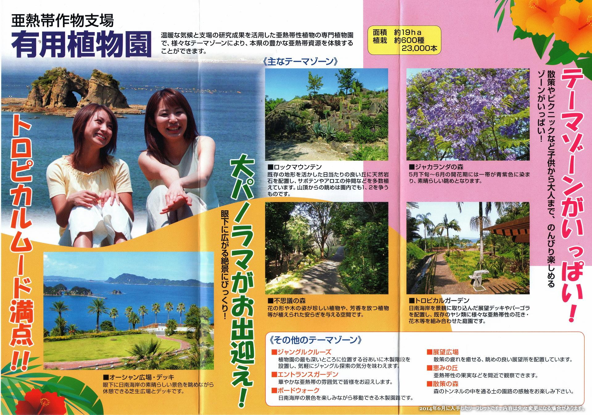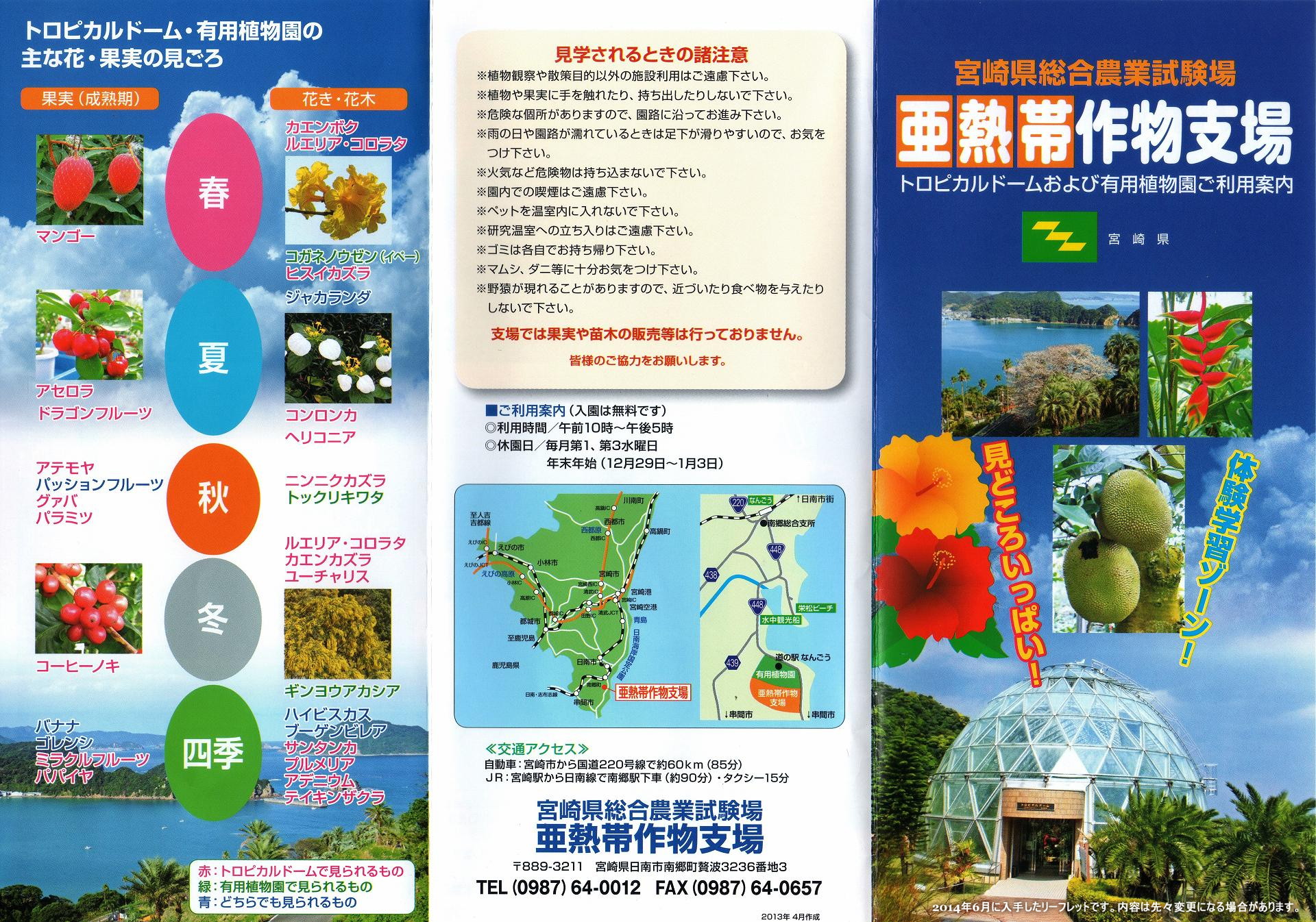 宮崎県総合農業試験場 亜熱帯作物支場 トロピカルドーム 有用植物園ご利用案内 パンフレット(リーフレット)宮崎県日南市南郷町にある「宮崎県総合農業試験場 亜熱帯作物支場 トロピカルドーム 有用植物園ご利用案内」のパンフレット(リーフレット)です。 最新情報は、公式サイト等を参照願います。 下記画像はクリックすると最大1920pix幅に拡大します。 ![]() ![]() ![]() ![]() 写真数枚 ![]() ![]() ![]() 日南のおいしいもの情報お昼は日南一本釣り カツオ炙り重はいかがでしょう。生でも良し! 炙っても良し! 茶漬けも良し! 美味しいですよ。 1,300円(2014年6月現在)です。 |
