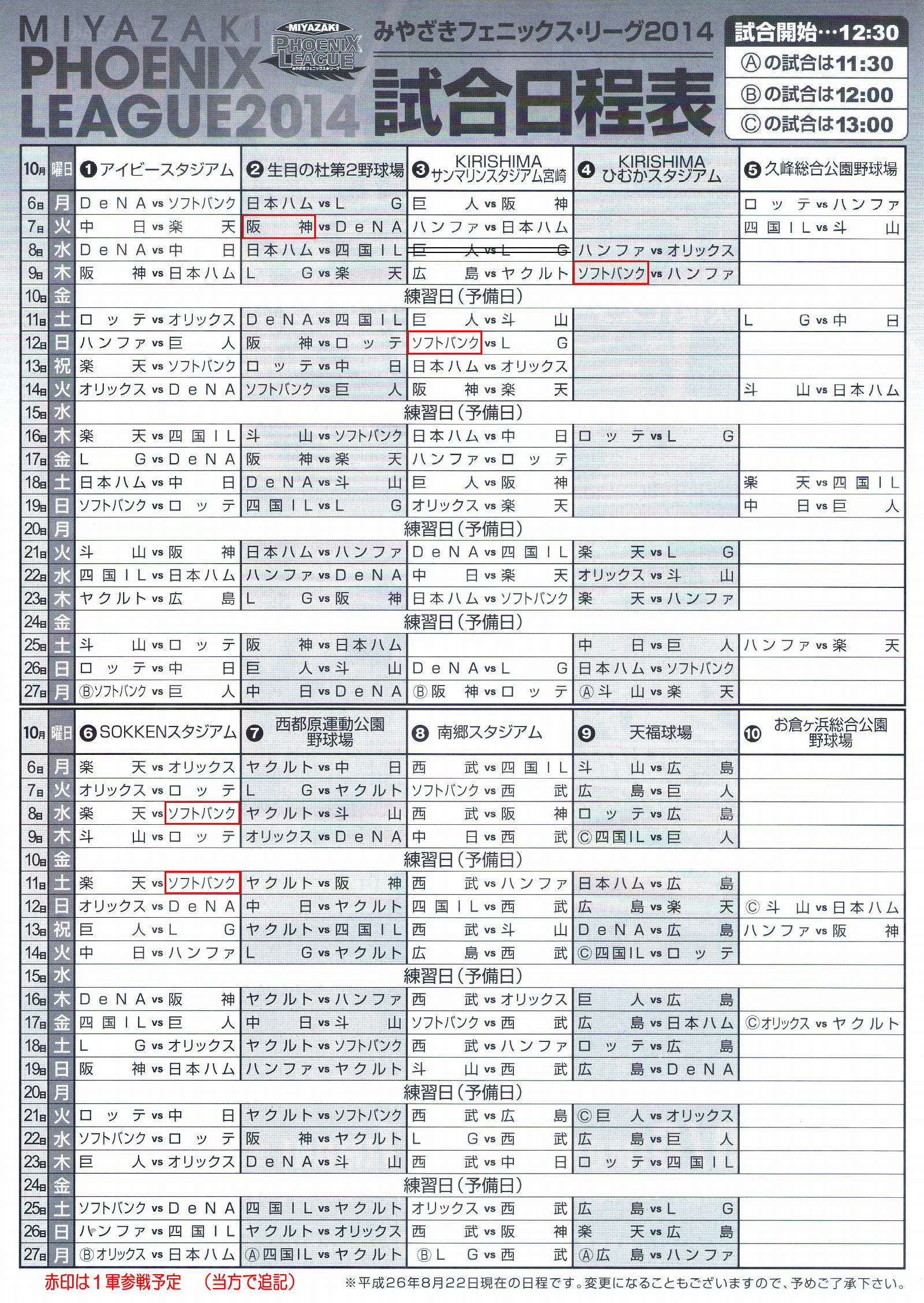 みやざきフェニックスリーグ2014のチラシ画像 (試合日程表) |