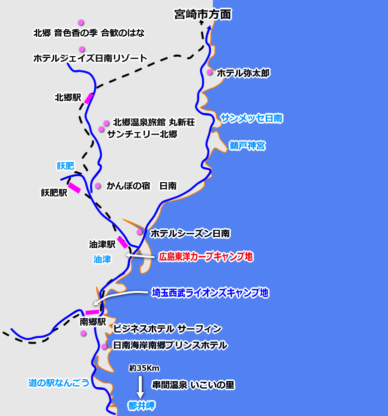 「ホテルジェイズ日南リゾート」は、宮崎空港から車で50分、宮崎駅から車で50分程度です。