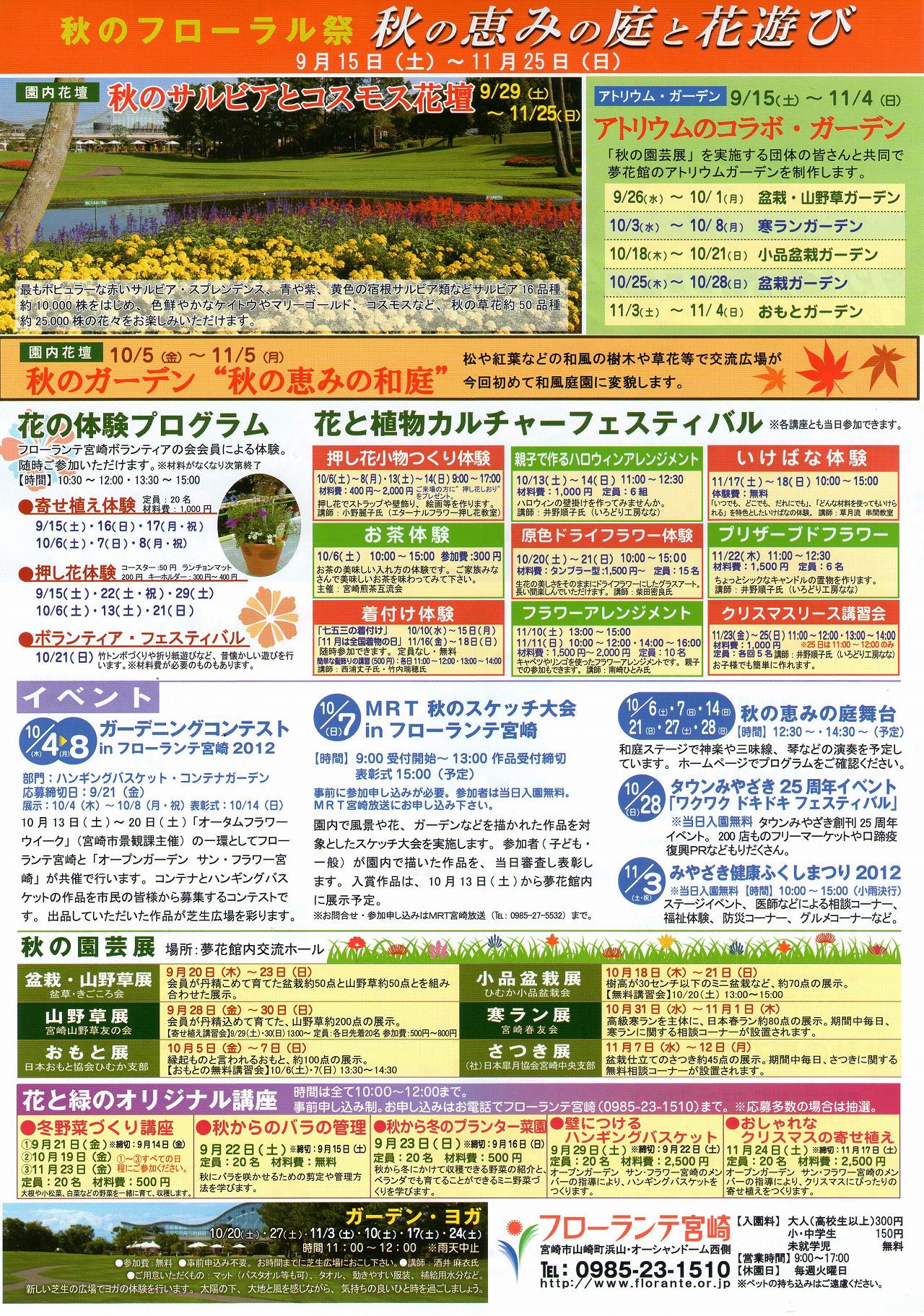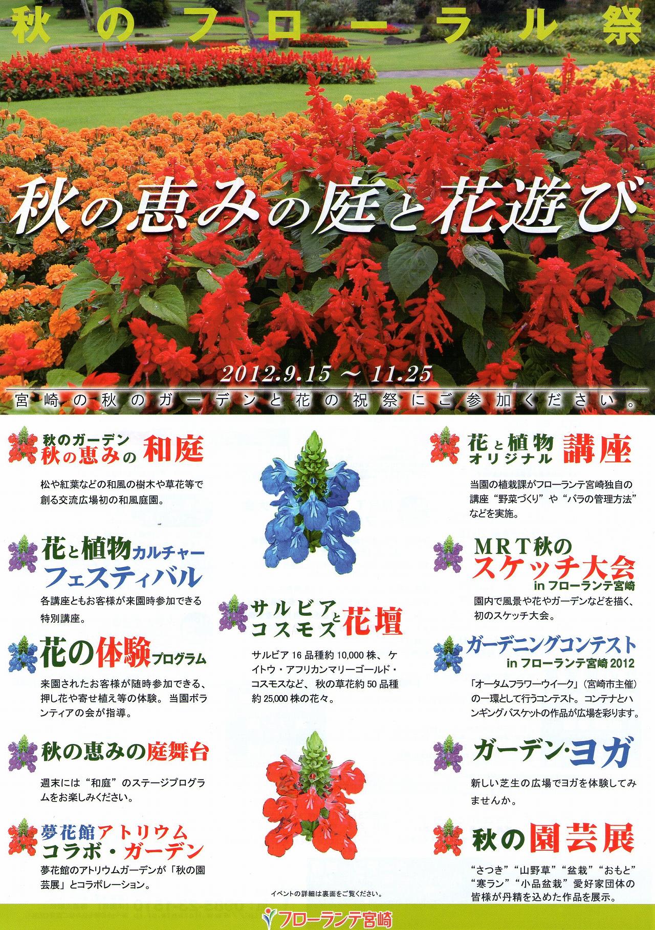 場所:フローランテ宮崎、 住所 〒880-0836 宮崎市山崎町浜山414-16 交通アクセス ・JR宮崎駅から車で約10分 ・宮崎自動車道宮崎ICより、一ツ葉有料道路南線経由で約15分(約11km) ・宮崎交通路線バスの18番線:宮交シティ〜青葉町〜シーガイアがフローランテ宮崎に停車。(終点) * 情報は発行時点のものです。 最新情報等は公式サイト等でご確認下さい。 * 下記 広告チラシは クリックすると拡大します。