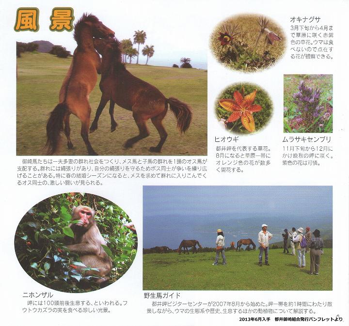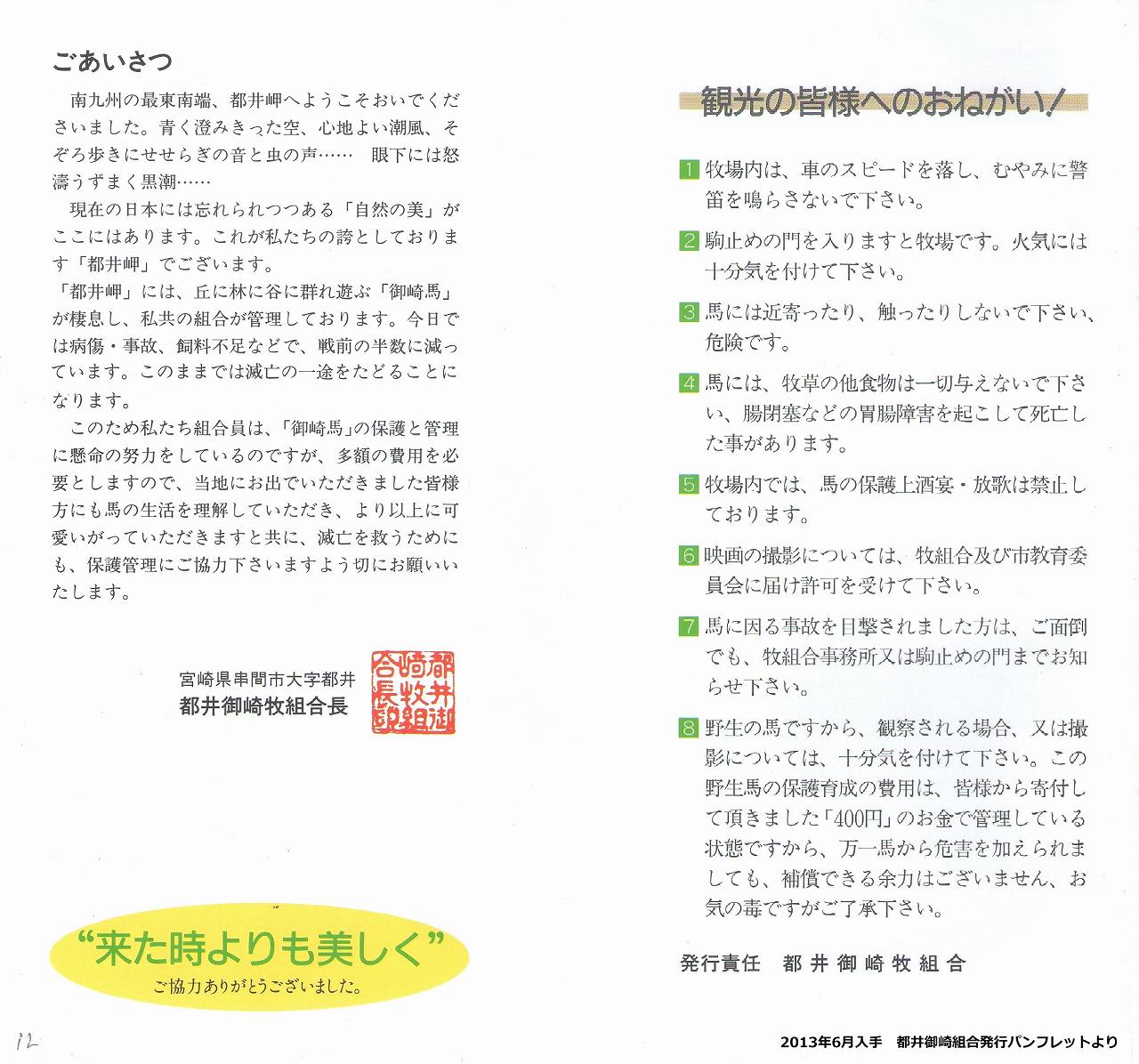 8 野生の馬ですから、観察される場合、又は撮影については、十分気を付けて下さい。この野生馬の保護育成の費用は、皆様から寄付して頂きました「400円」のお金で管理している状態ですから、万一馬から危害を加えられましても、補償できる余力はございません、お気の毒ですがご了承下さい。 発行責任 都井御崎牧組合