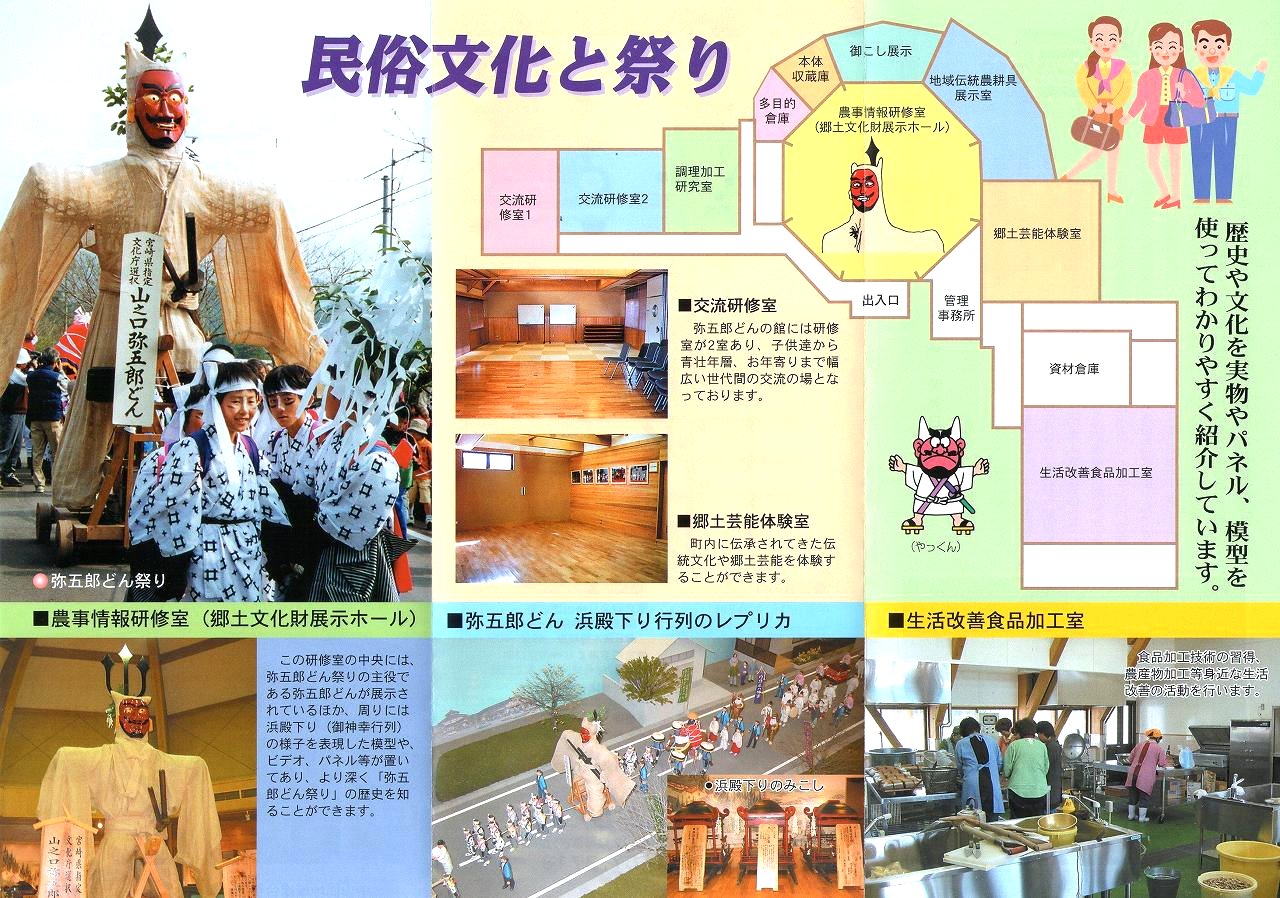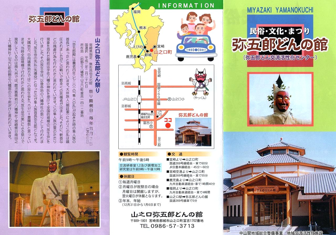 山之口弥五郎どん祭り国選択 平成二年二月二十七日所在地 (的野正八幡宮)山之口町富吉l四一二番地 「弥五郎殿」は養老四年(七二〇)の「隼人の乱」が起きた時の隼人族の首長であったと言われています。大伴旅人(朝廷軍)によりこの乱は鎮圧されましたがこの戦いで数多<の死傷者が出ました。それに、斬首などの残虐行為も行われたと言われています。この隼人族の霊のたたり現象を恐れた朝廷は宇佐八幡の神託を受けて全国的規模の「放生会」を行いました。 大隅地方、日向諸県地方ではこの放生会を「ホゼ」=豊穣祭と言っています。当時全国規模で行われたと思われる「放生会次第」による祭りで現存しているのは南九州では、鹿児島県岩川八幡神社・宮崎県日南田之上八幡神社・山之口町的野正八幡宮の三ケ所だけと言われています。 弥五郎どんの館パンフレット