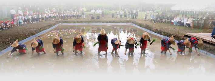 早乙女によるお田植えハレ着(紺の単衣に赤い帯、白い手ぬぐい、新しい菅笠)の早乙女は宮崎農業高校の生徒、みこ、保育士たち11名![]() ![]() |
