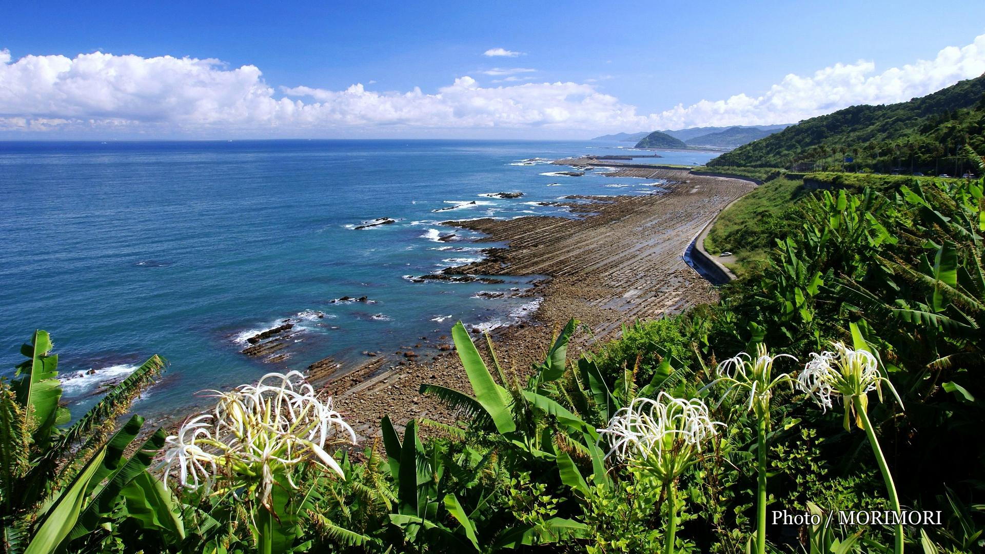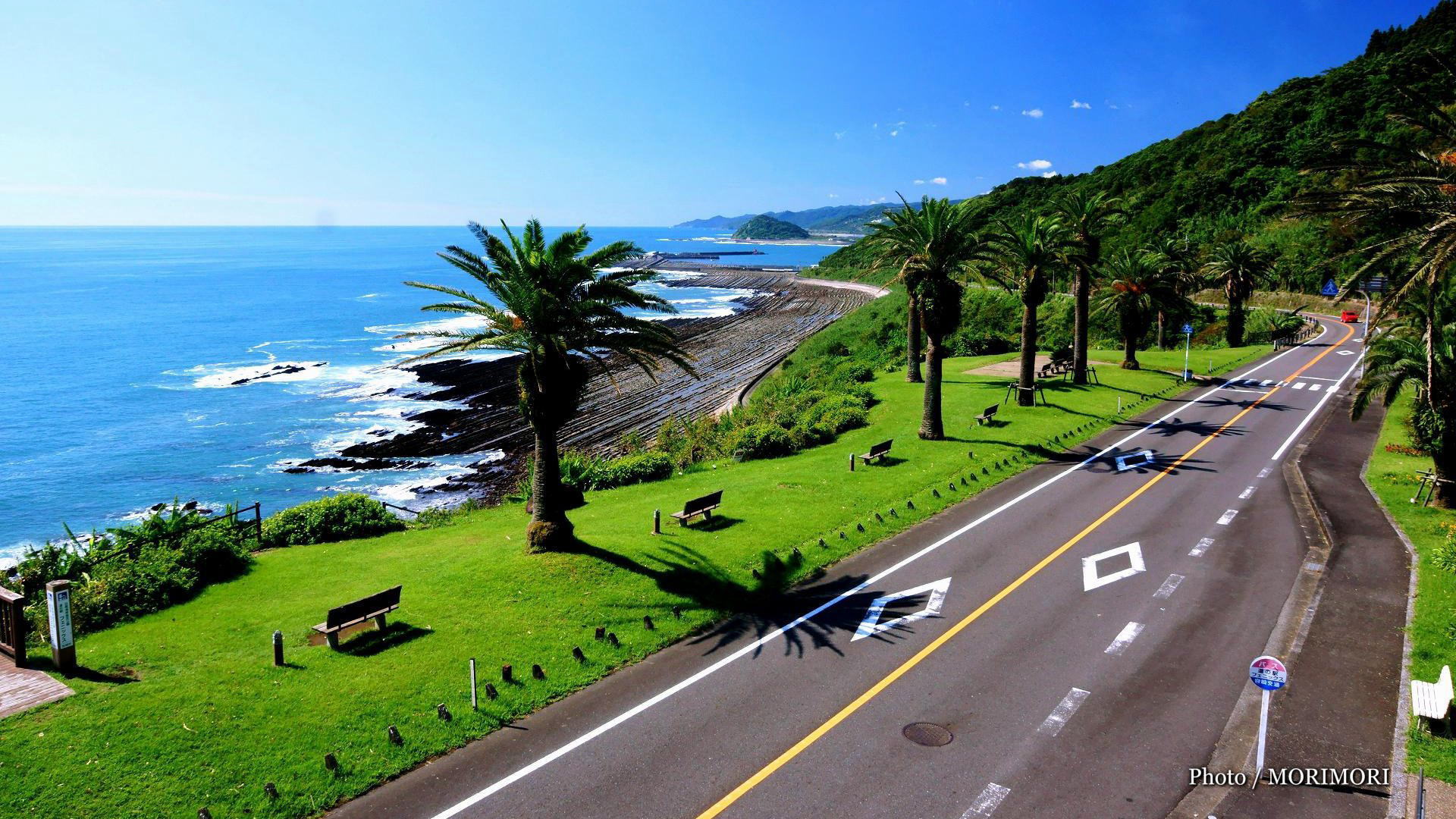 フェニックス(カナリーヤシ)ごしに見る青い海・青い空・浮かぶ白い雲、鬼の洗濯板と称されるい波状岩の海岸線、宮崎を代表する景色が広がります。