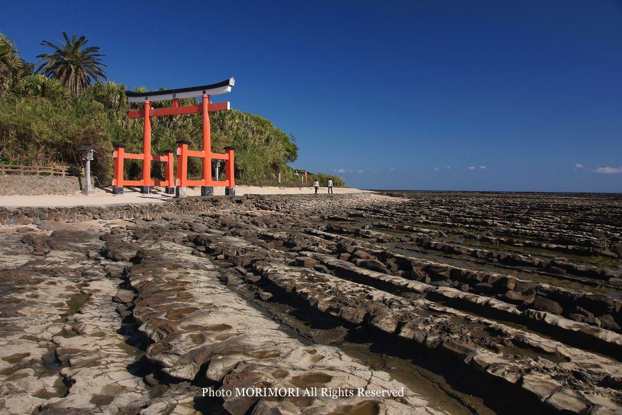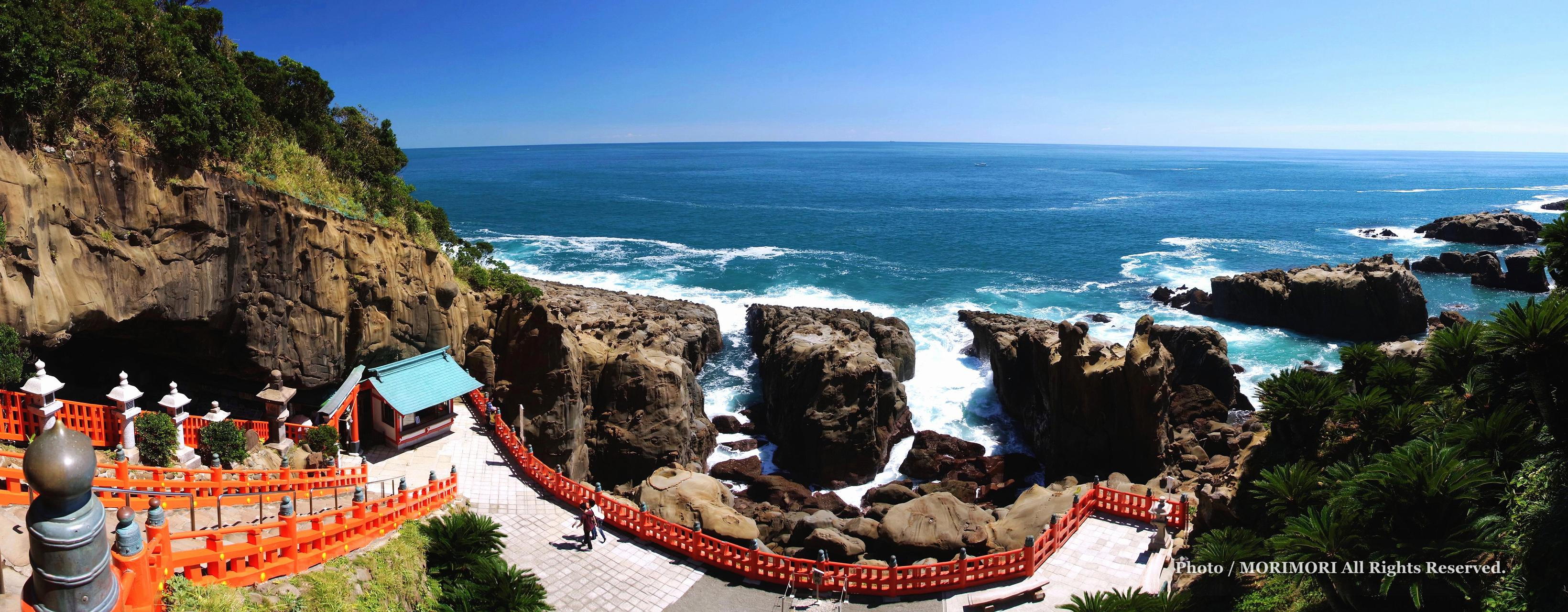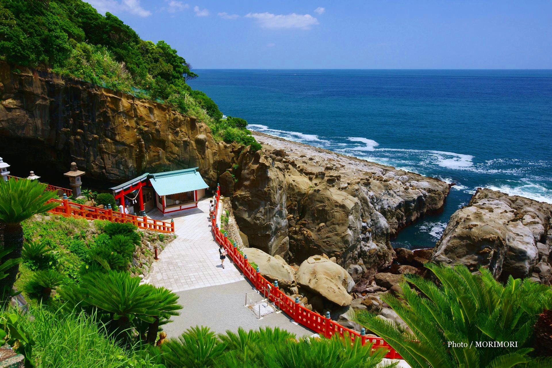断崖絶壁の大洞窟(およそ千平方メートル(約三百坪)の中に朱塗りの御本殿をかまえる「鵜戸神宮」は、安産、夫婦円満、育児、漁業、航海 そして縁結びの神として 古くから信仰を集め、念流陰流 剣法発祥の地としても知られています。目の前に広がる紺碧の海との朱塗りの社・・素晴しい景勝地です。