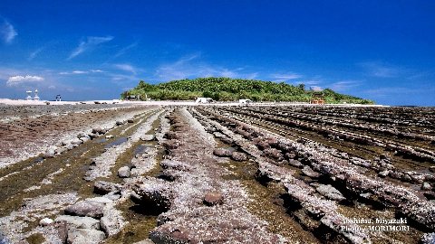 青島の周囲は、約1000万年から800万年前の地層(硬さの違う砂岩と泥岩)が、侵食により独特な形状へ変化した岩で囲まれており、干潮の際には沖合い100mにも及ぶ見事な景観となります。その奇岩の形が、洗濯板に似ている事から 「