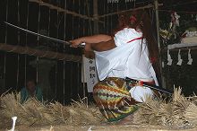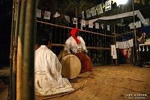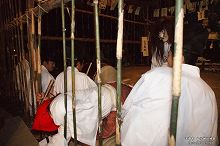神楽の写真 (ページ内アンカーリンク)|神楽の舞われる神屋(こうや)等の様子|13番 榊荒神|12番 はさみ舞|16番 四方鬼神| |9番 笠取鬼神|18番 一人剣|15番 神奈喜(かんなき)|22番 二人剣|27番 綱荒神|24番 岩貫| |25番 磐石(ばんぜき)|28番 綱切り|こどもたちの神楽| 神楽の舞われる神屋(こうや)等の様子穂北神楽も同様ですが、この辺りの神楽は神屋を囲むように竹を檻のように張巡らせているのが非常に印象的でした。![]() ![]() |