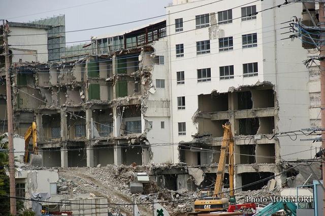 旧橘ホテル解体工事の写真|宮崎市青島以前、解説者のひとりごと「旧青島橘ホテルの再開発は和多屋別荘系を選定」 の中で 「宮崎市青島にある、旧青島橘ホテルの解体工事は2009年12月17日に着工 12月末から建物内部の解体工事を開始、2010年2月中旬から建物本体の解体に取り掛かる。」 ・・と、書きましたが、先日、旧橘ホテルの前を通ったところ、外部の解体工事が進んでいるようで、数割が取崩されておりました。 写真を撮りましたのでいくつかご紹介します。 見ていて、なんだか感慨深いものがありました。 旧橘ホテル解体工事 施工 坂下・大和開発JV |