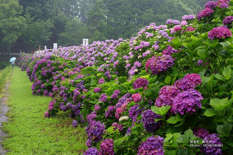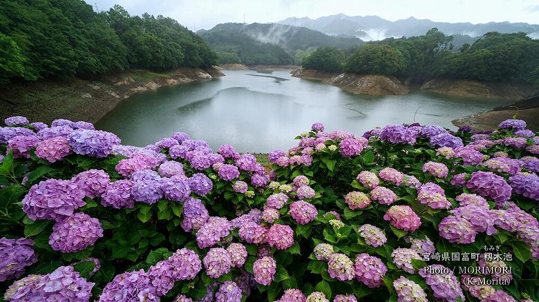 国富町にある、籾木池(もみき池)の周辺には色とりどりのアジサイ約500本が植栽されており。毎年6月上旬から中旬に見頃を迎えます。